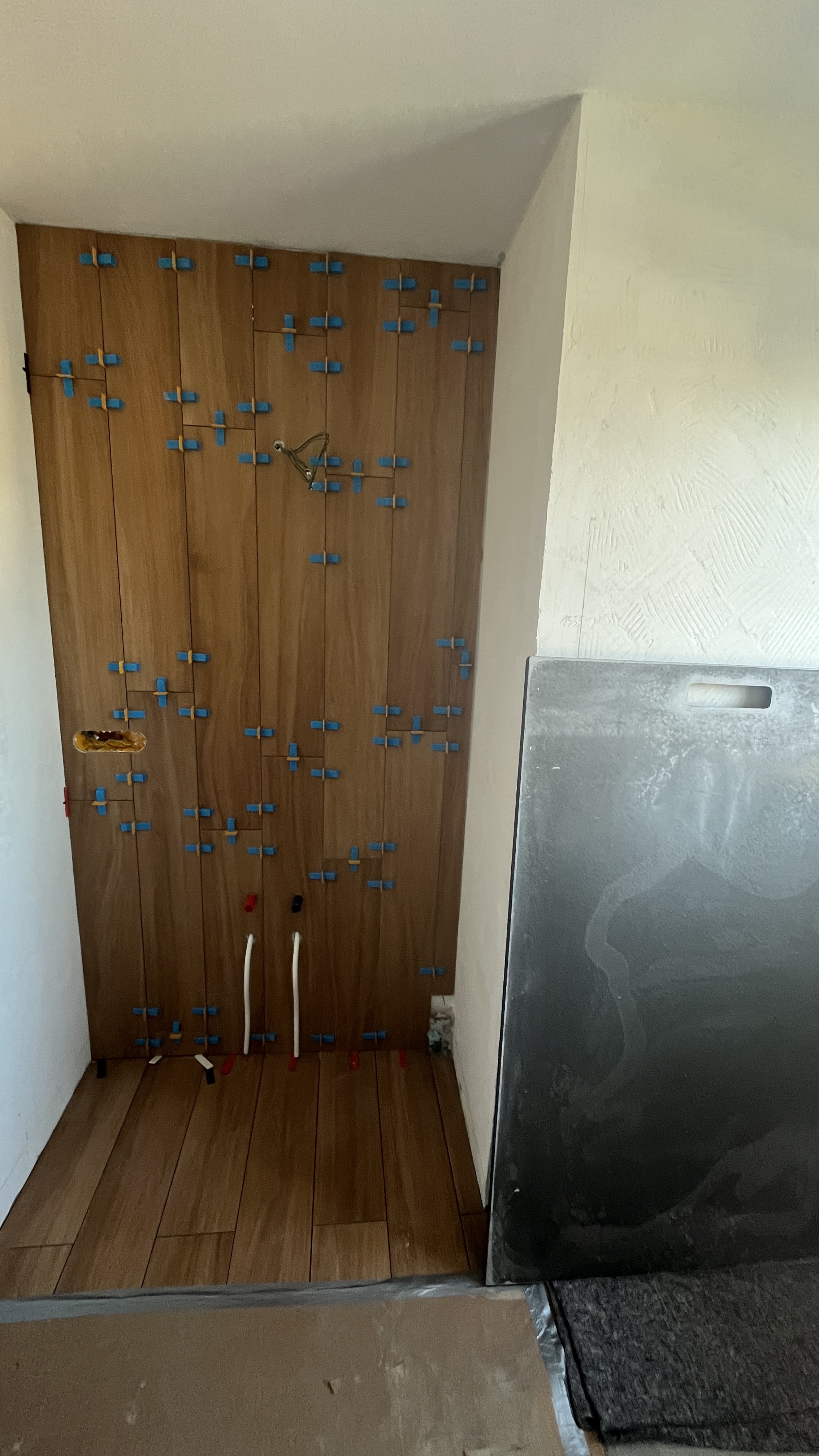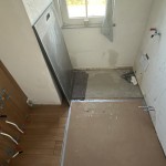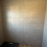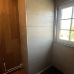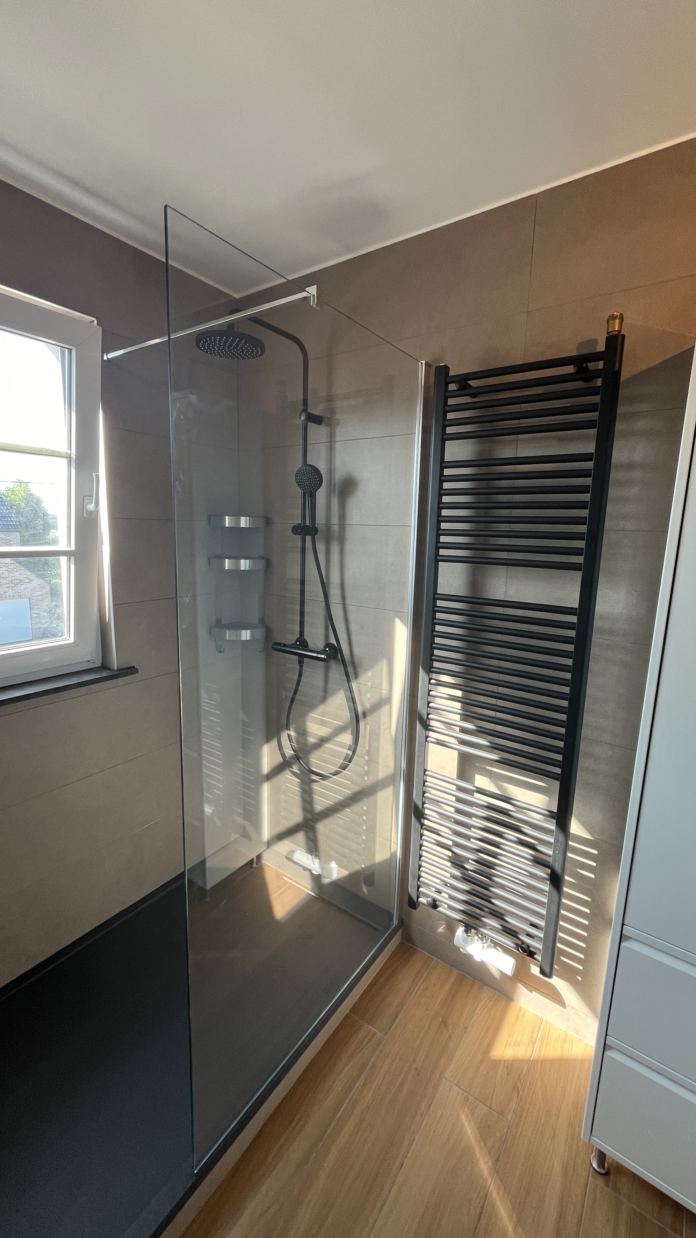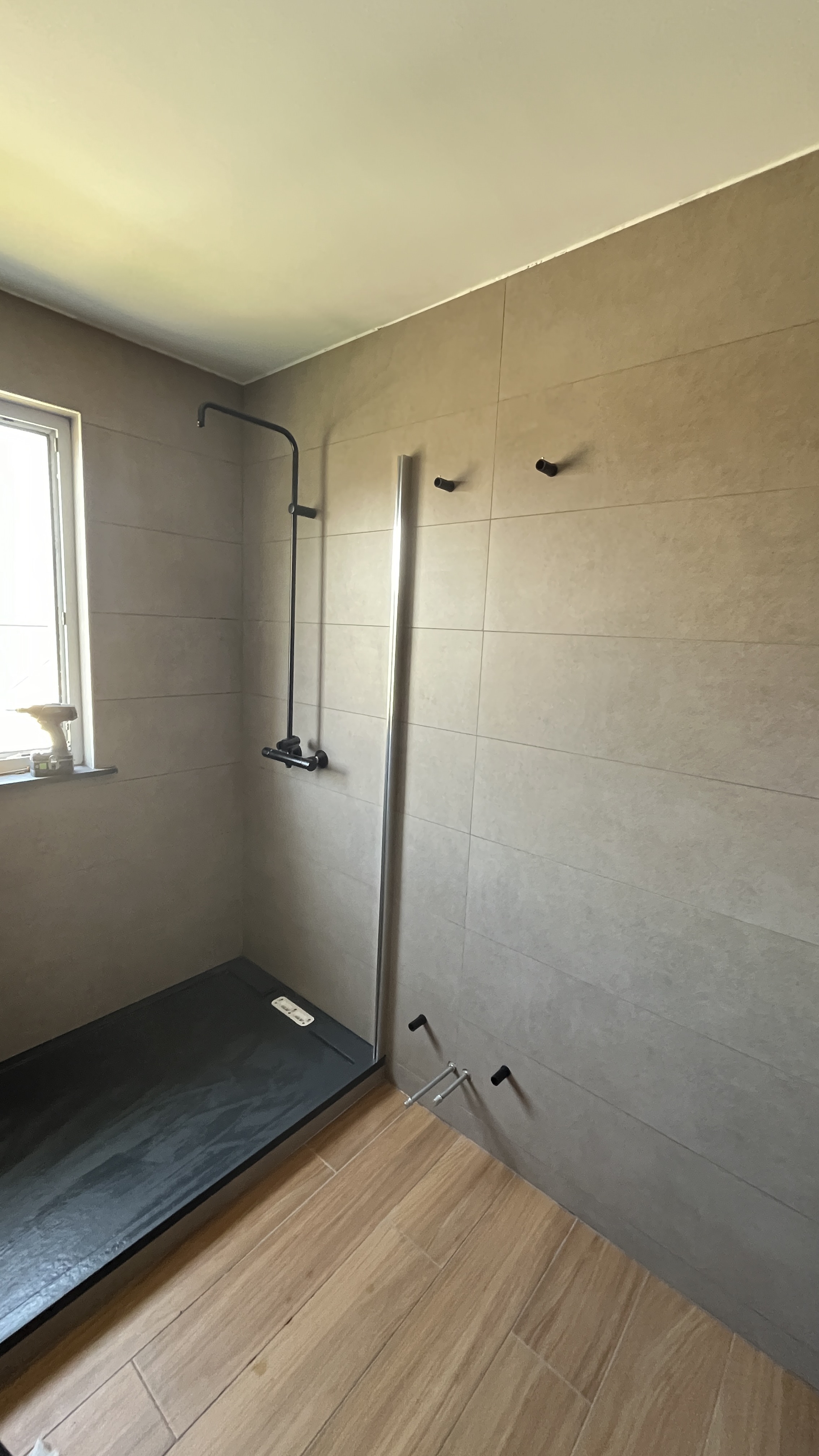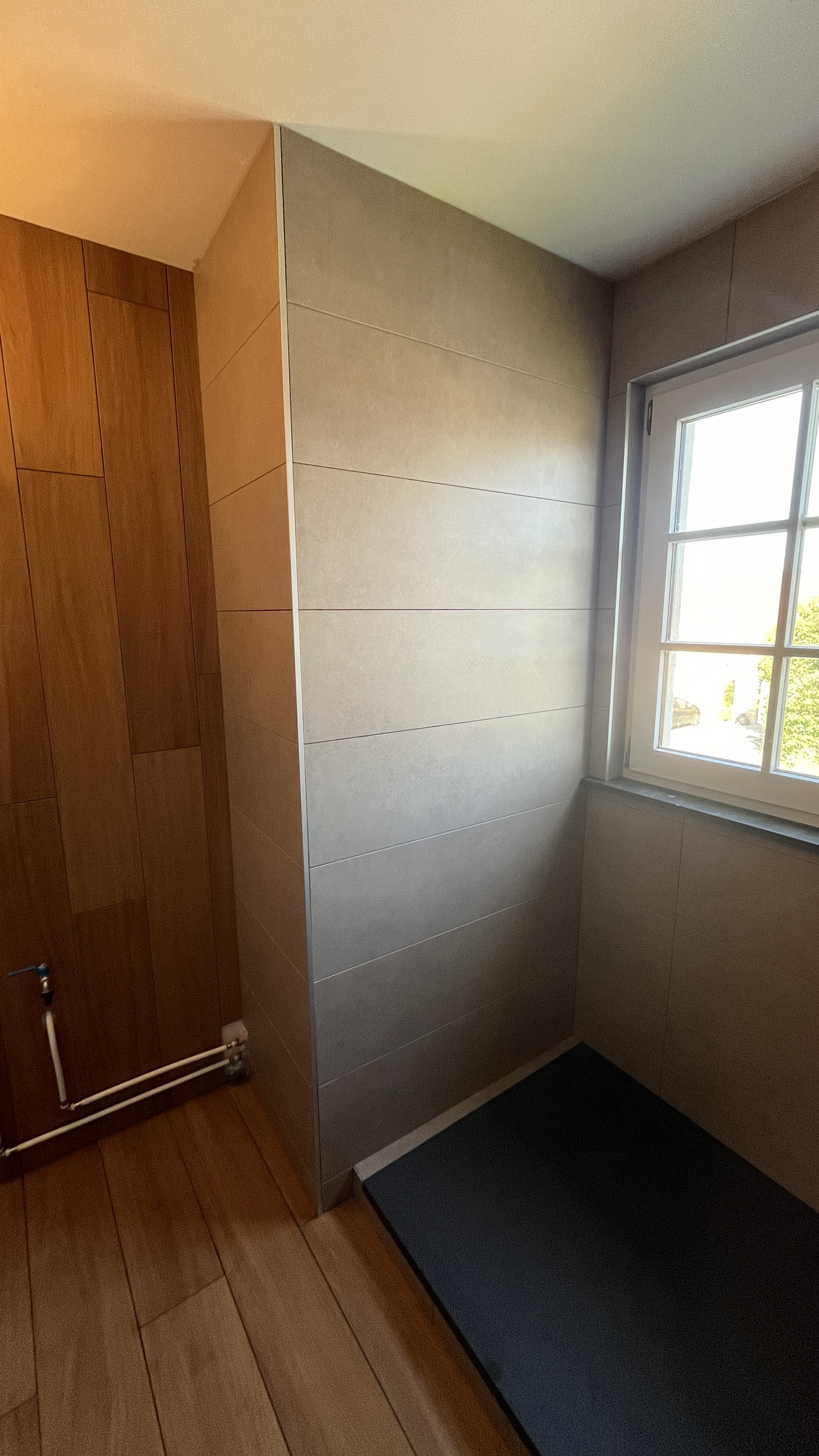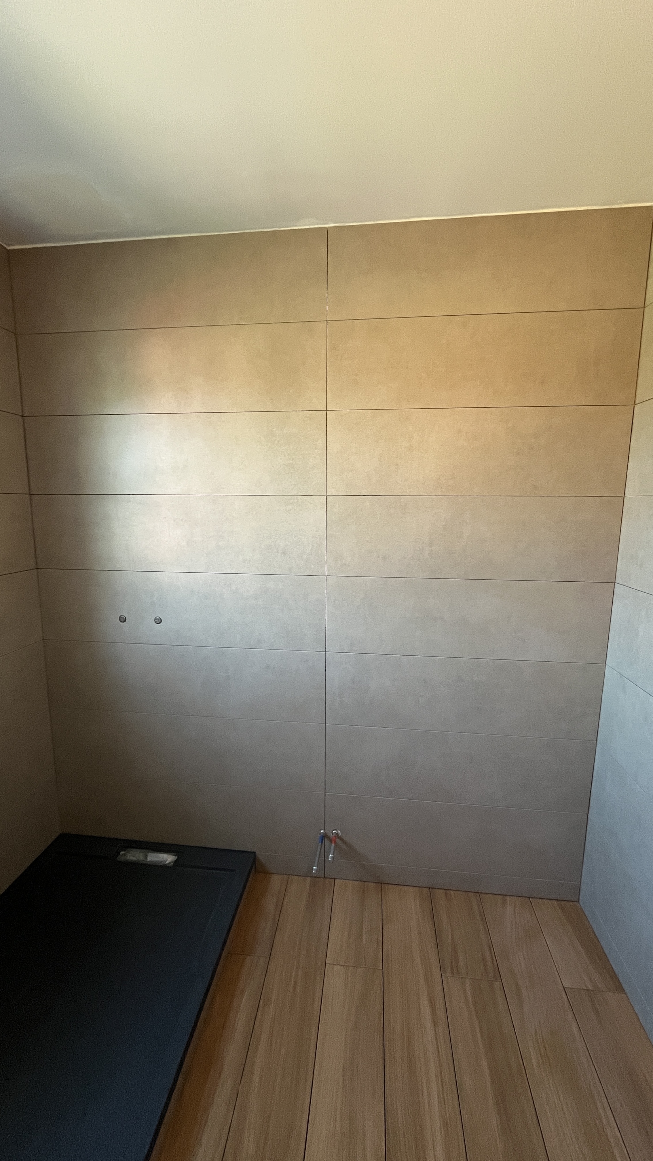 Démontage du bain , modifications des évacuations et alimentations , pose d'un receveur de douche avec paroi vitrée , carrelage imitation bois et béton