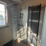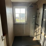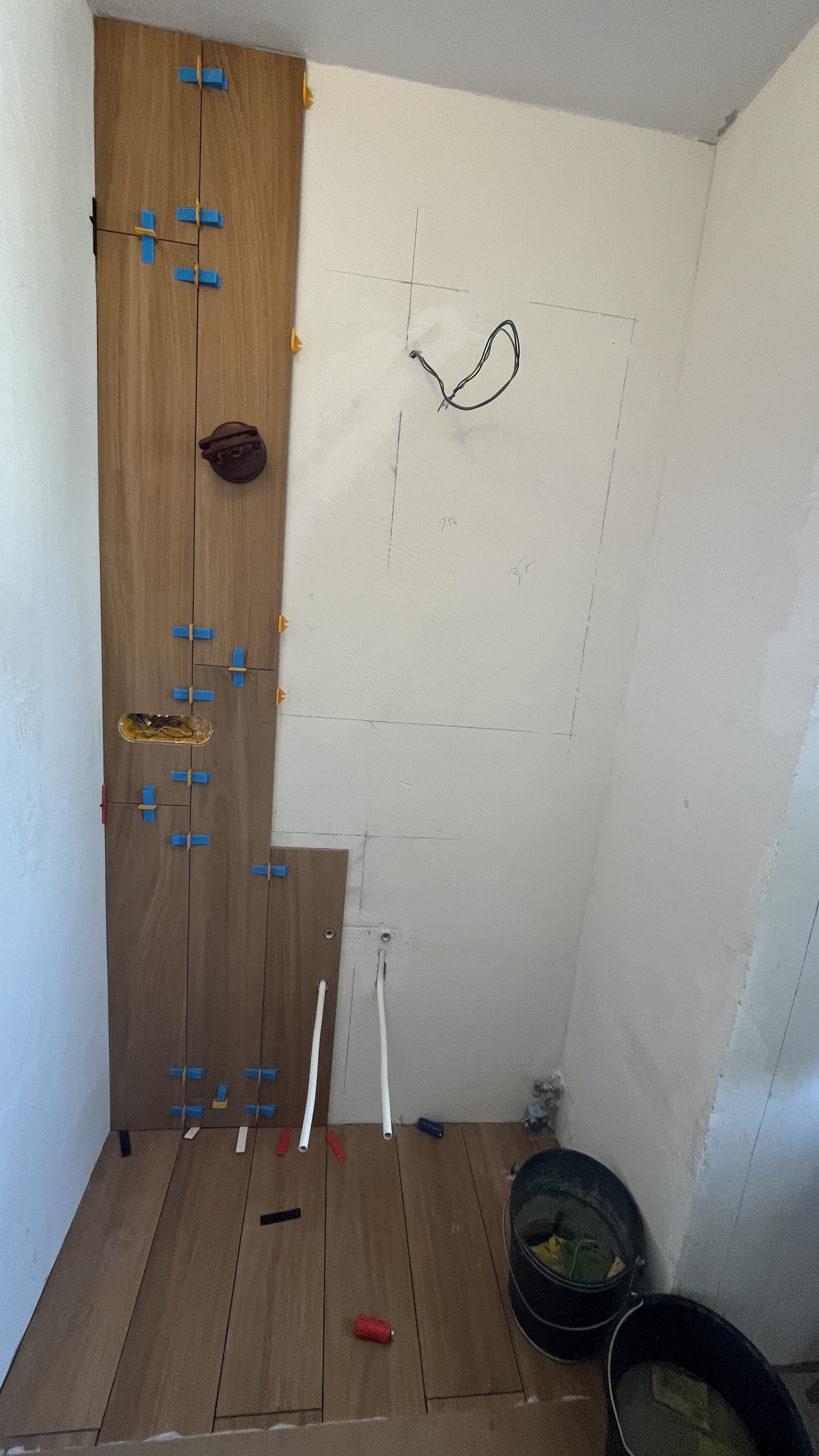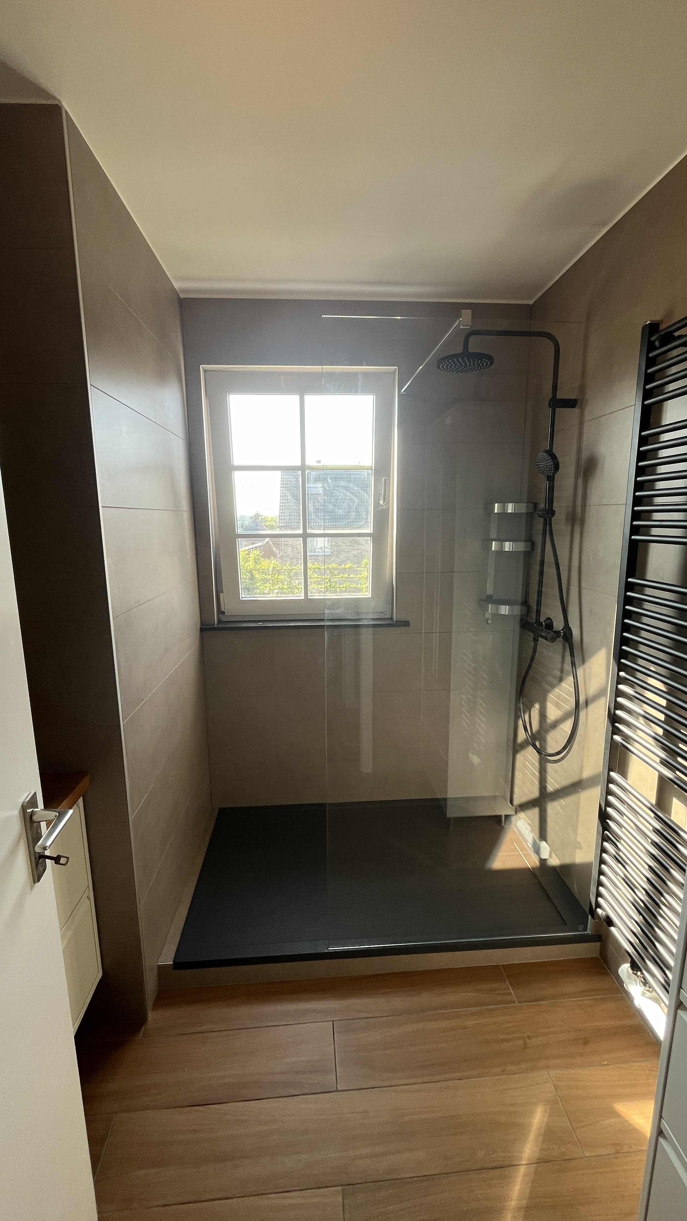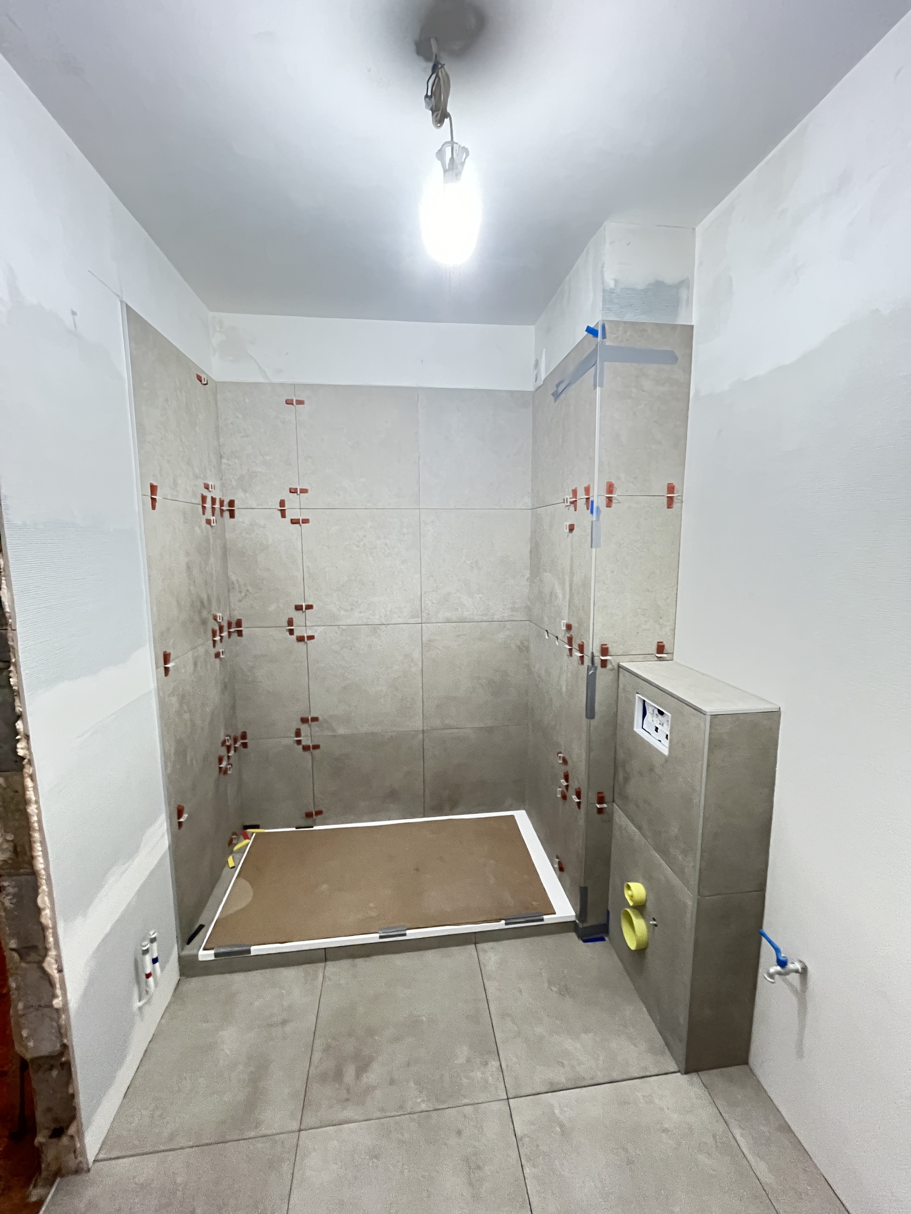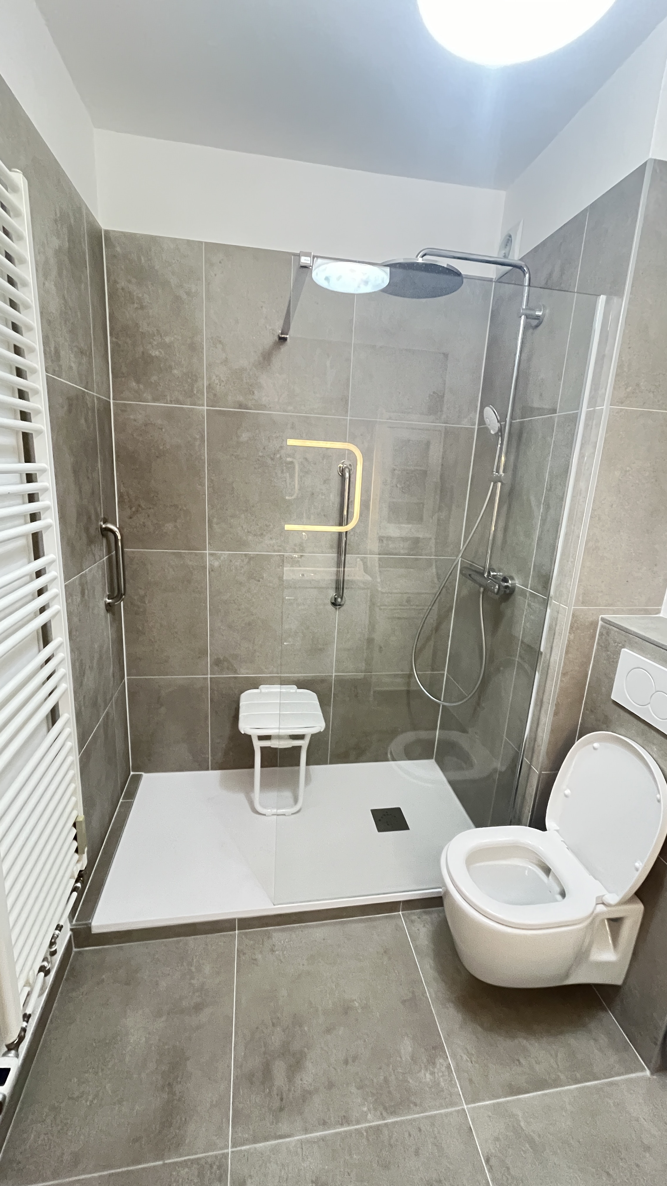 Démontage du bain , modifications des évacuations et alimentations , pose d'un receveur de douche avec paroi vitrée , carrelage imitation bois et béton