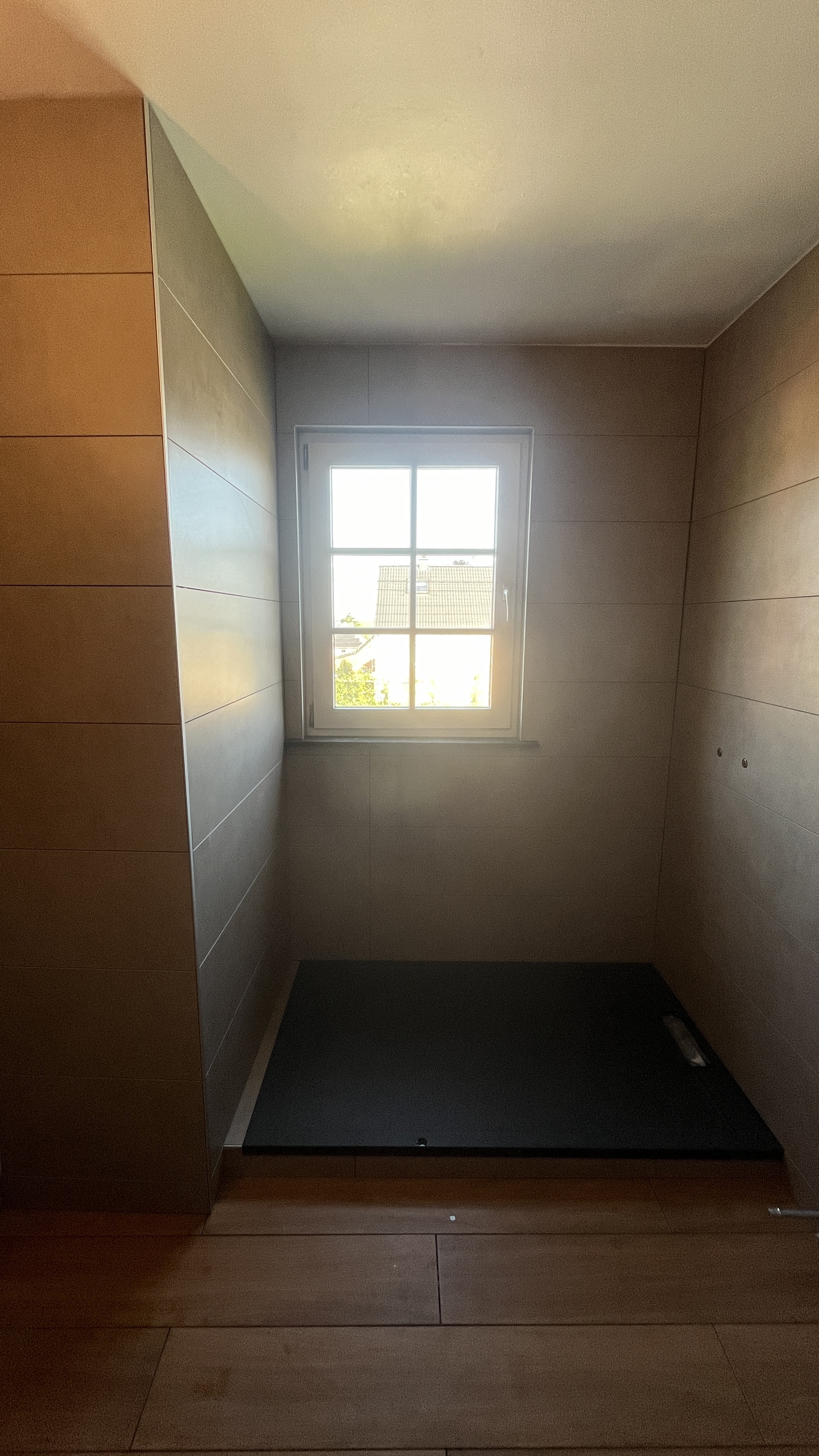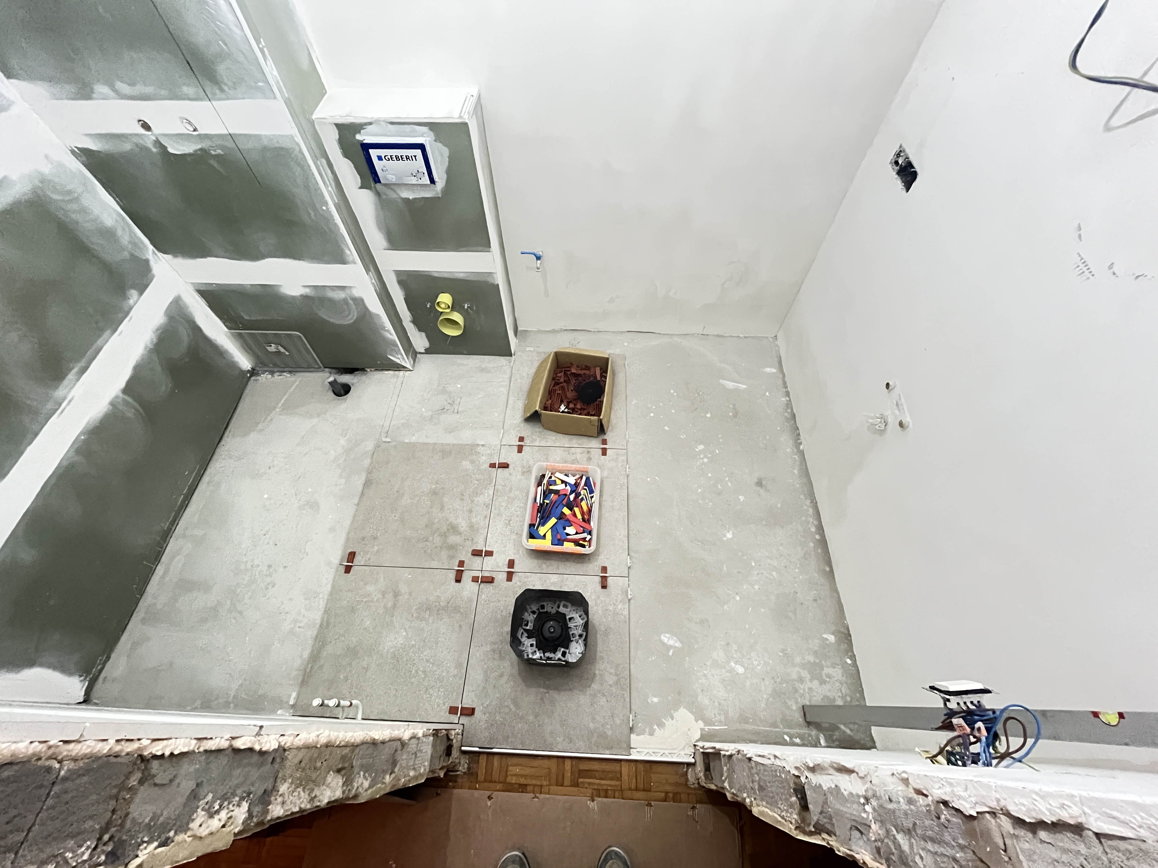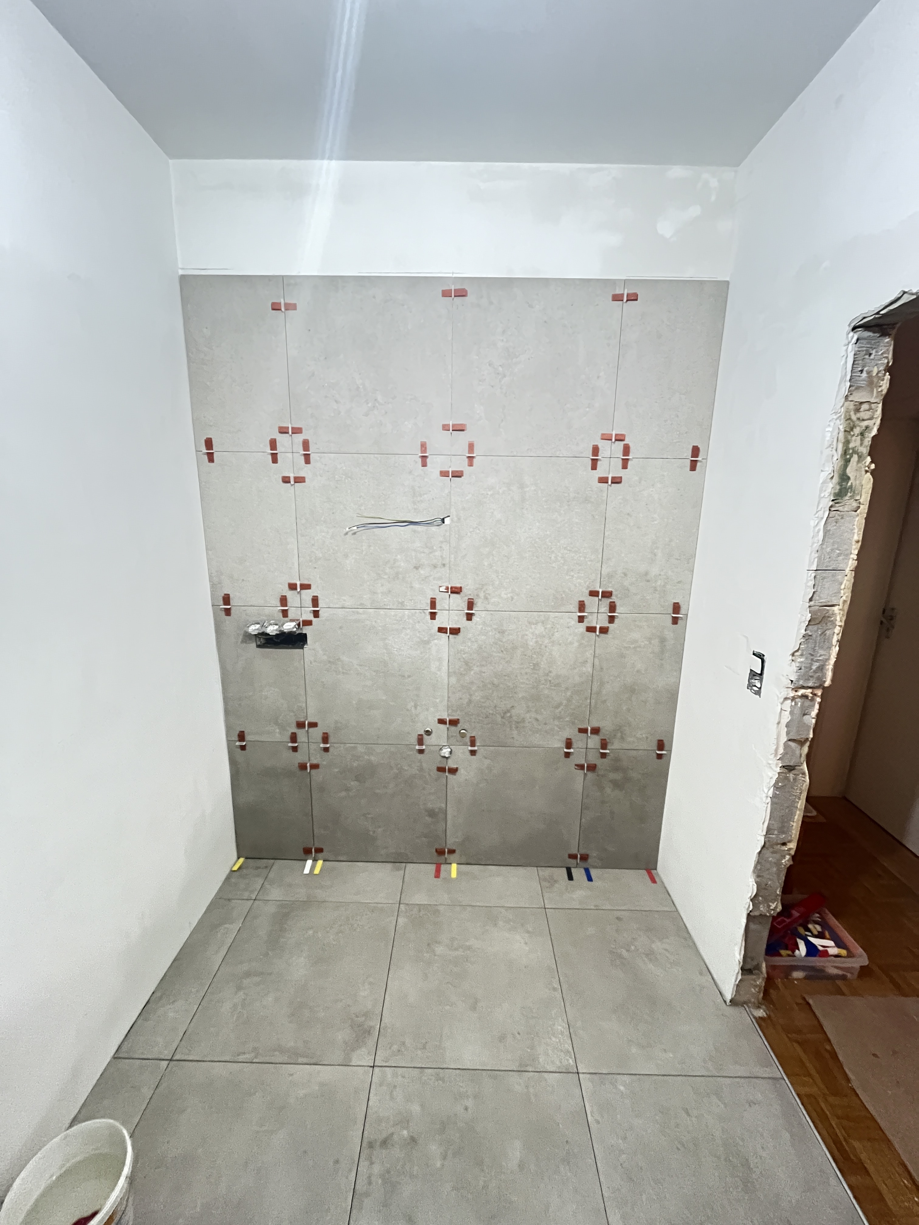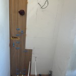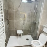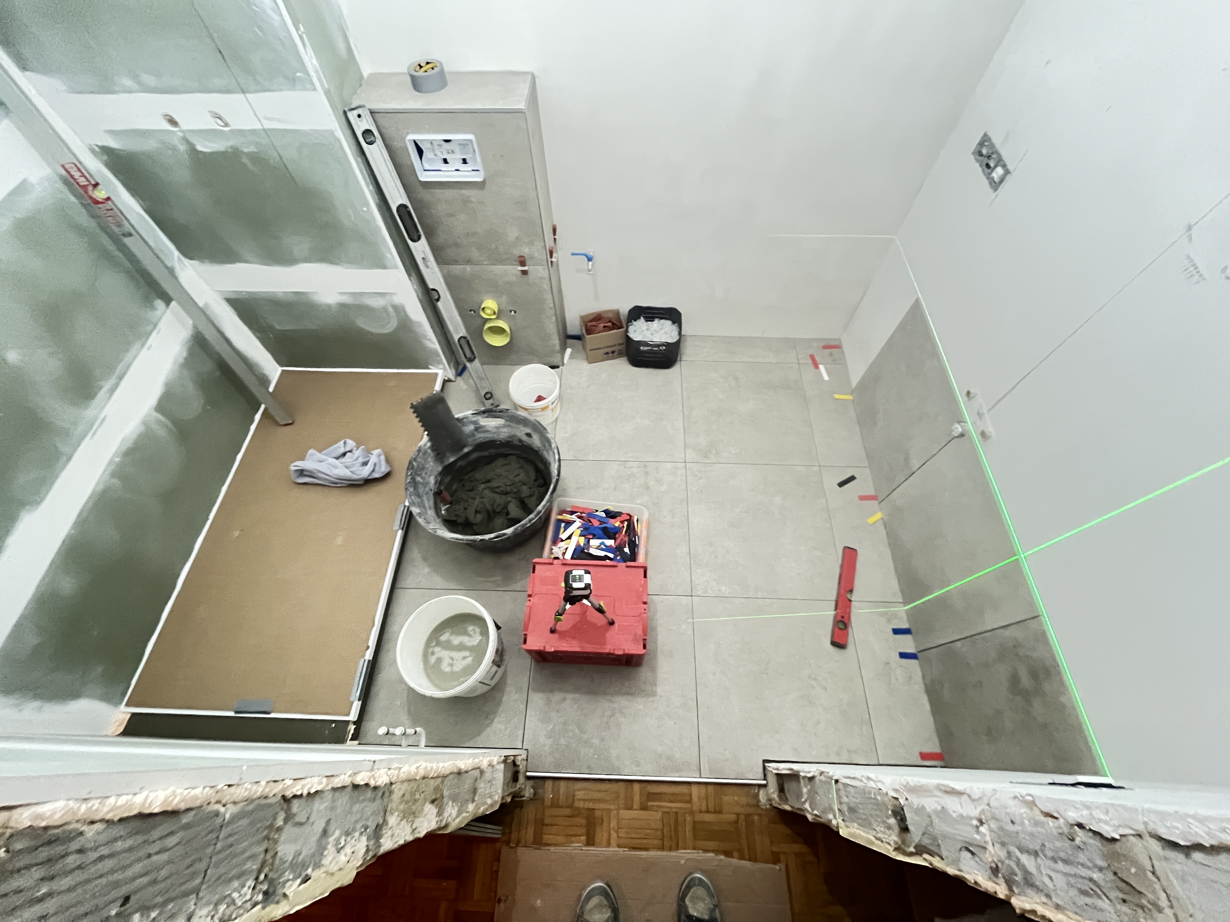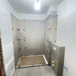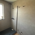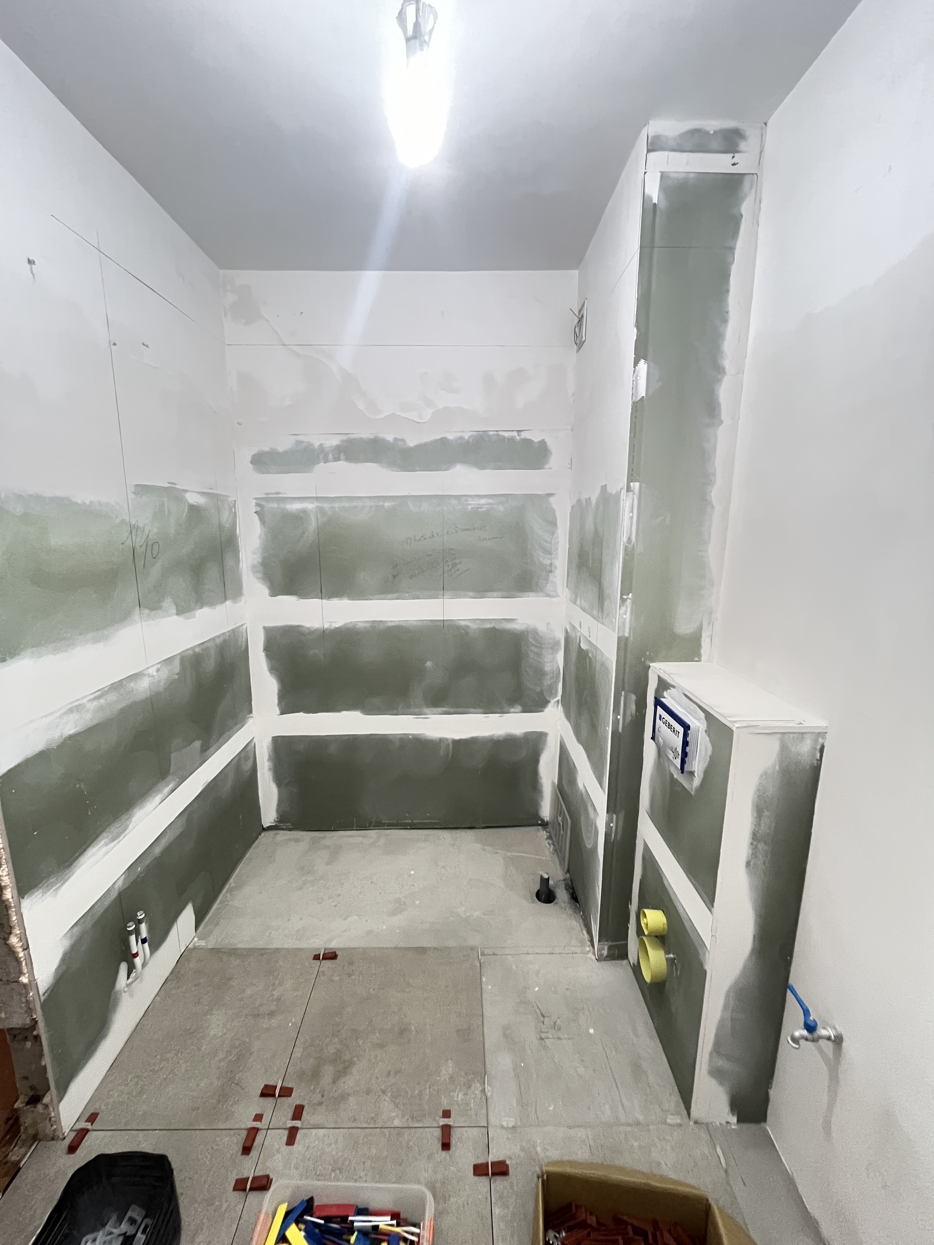 Démontage du bain , modifications des évacuations et alimentations , pose d'un receveur de douche avec paroi vitrée , carrelage imitation bois et béton