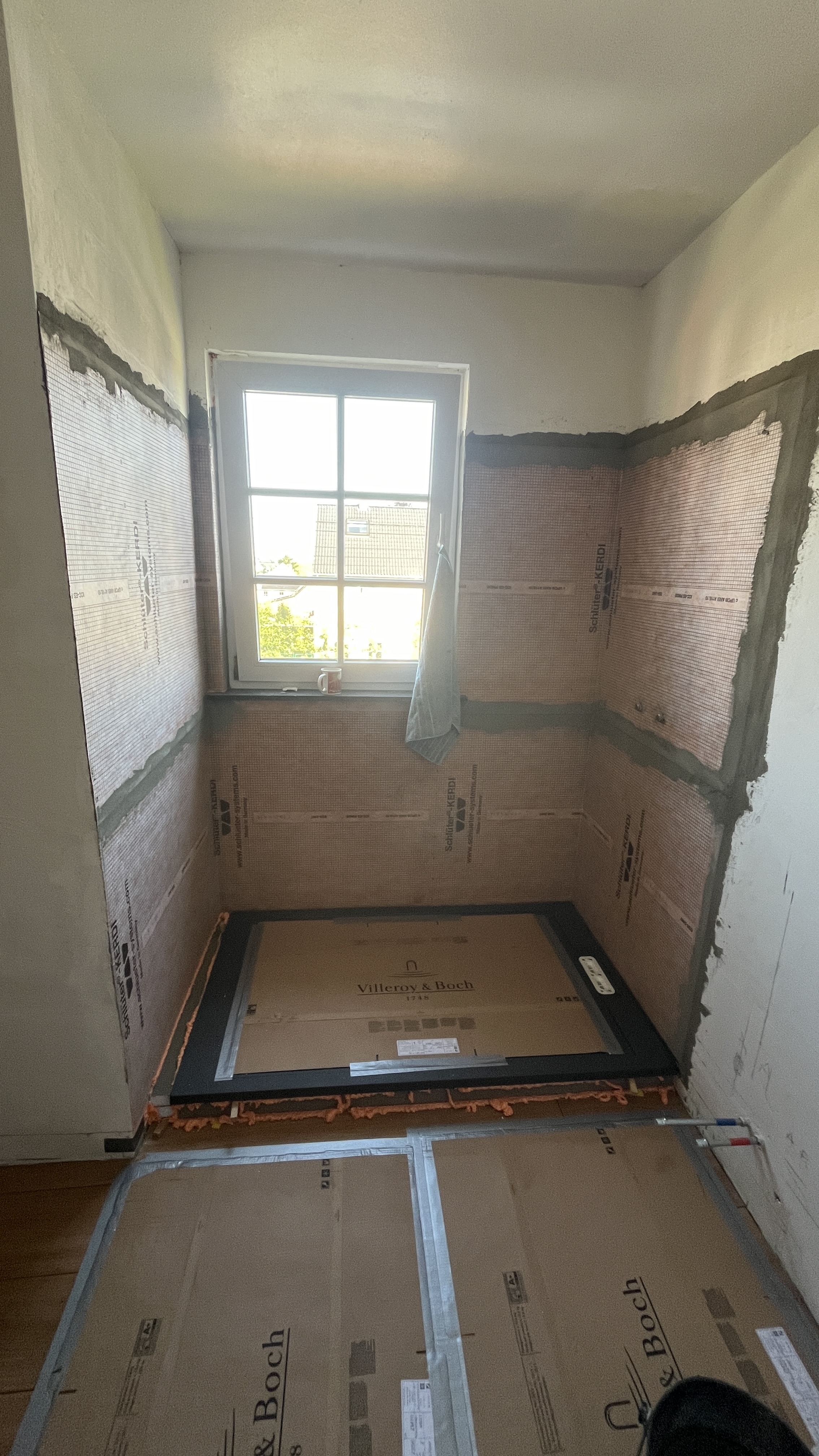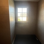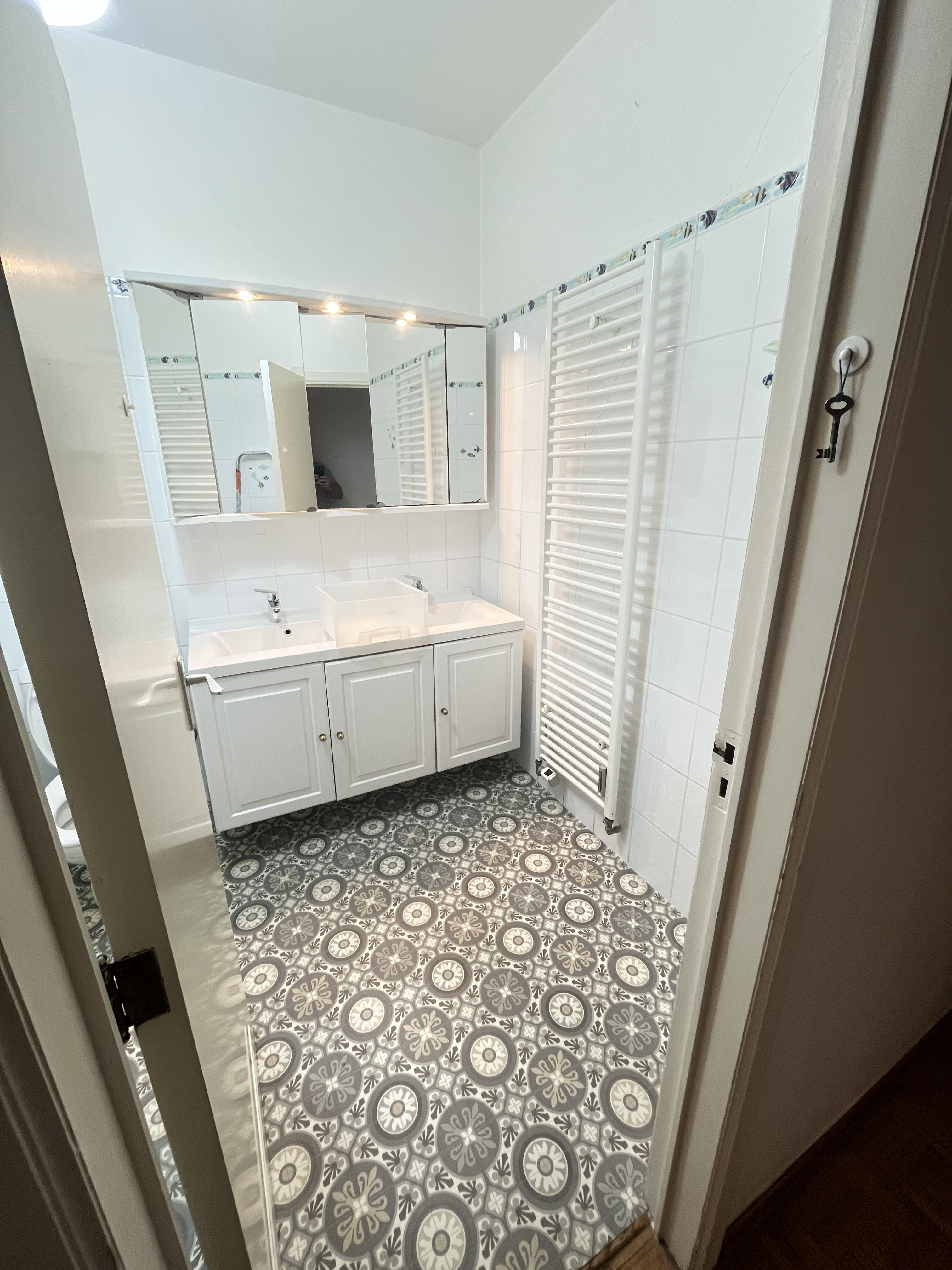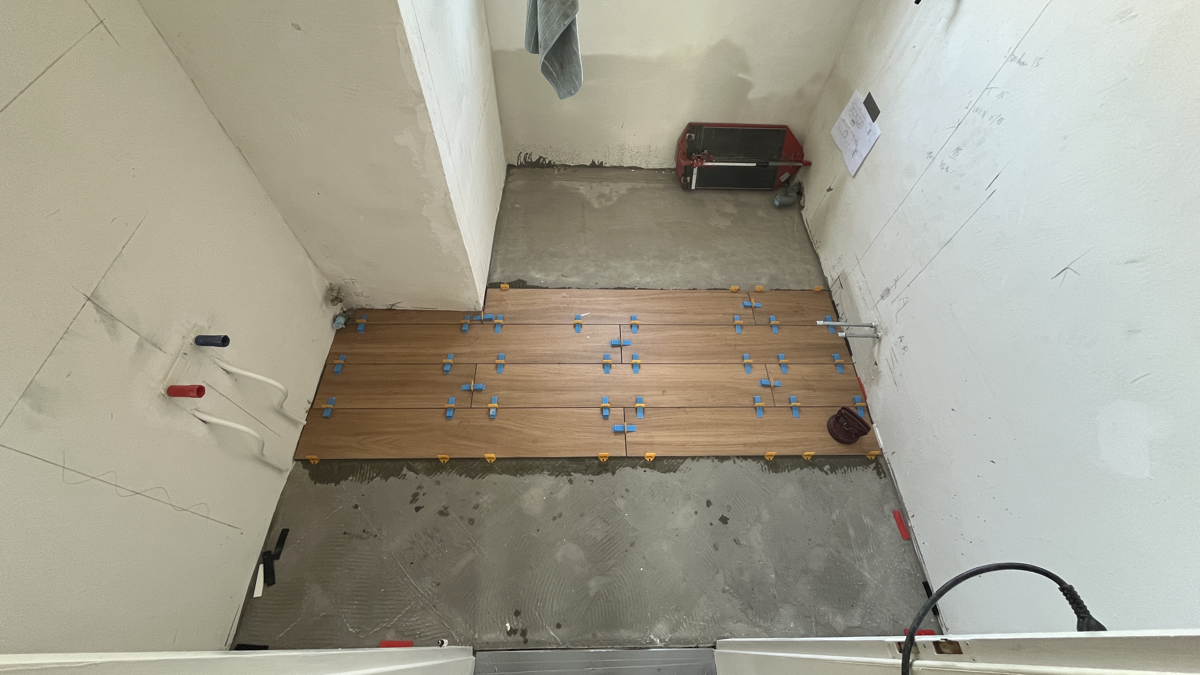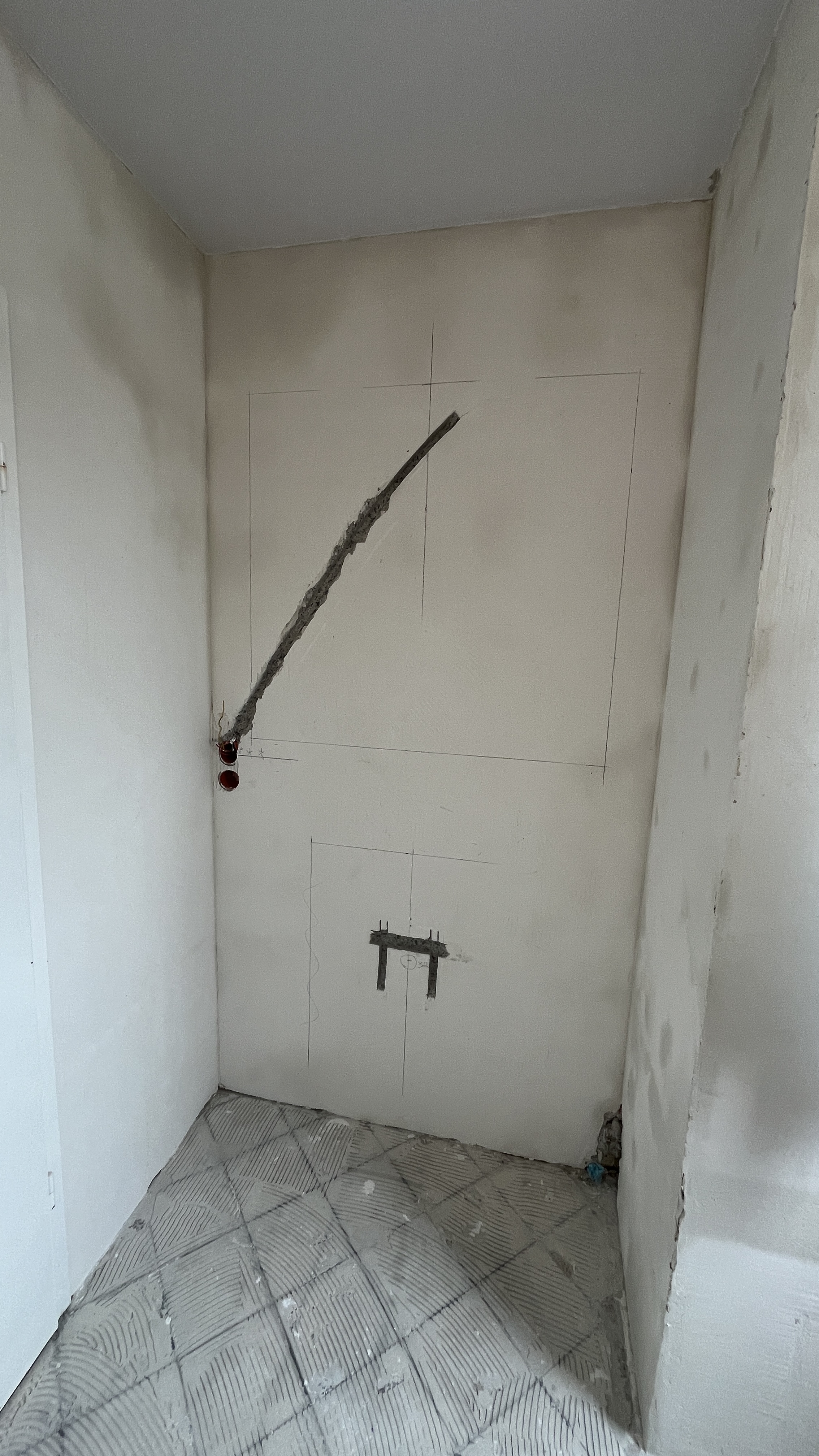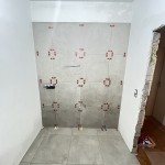 Démontage du bain , modifications des évacuations et alimentations , pose d'un receveur de douche avec paroi vitrée , carrelage imitation bois et béton