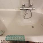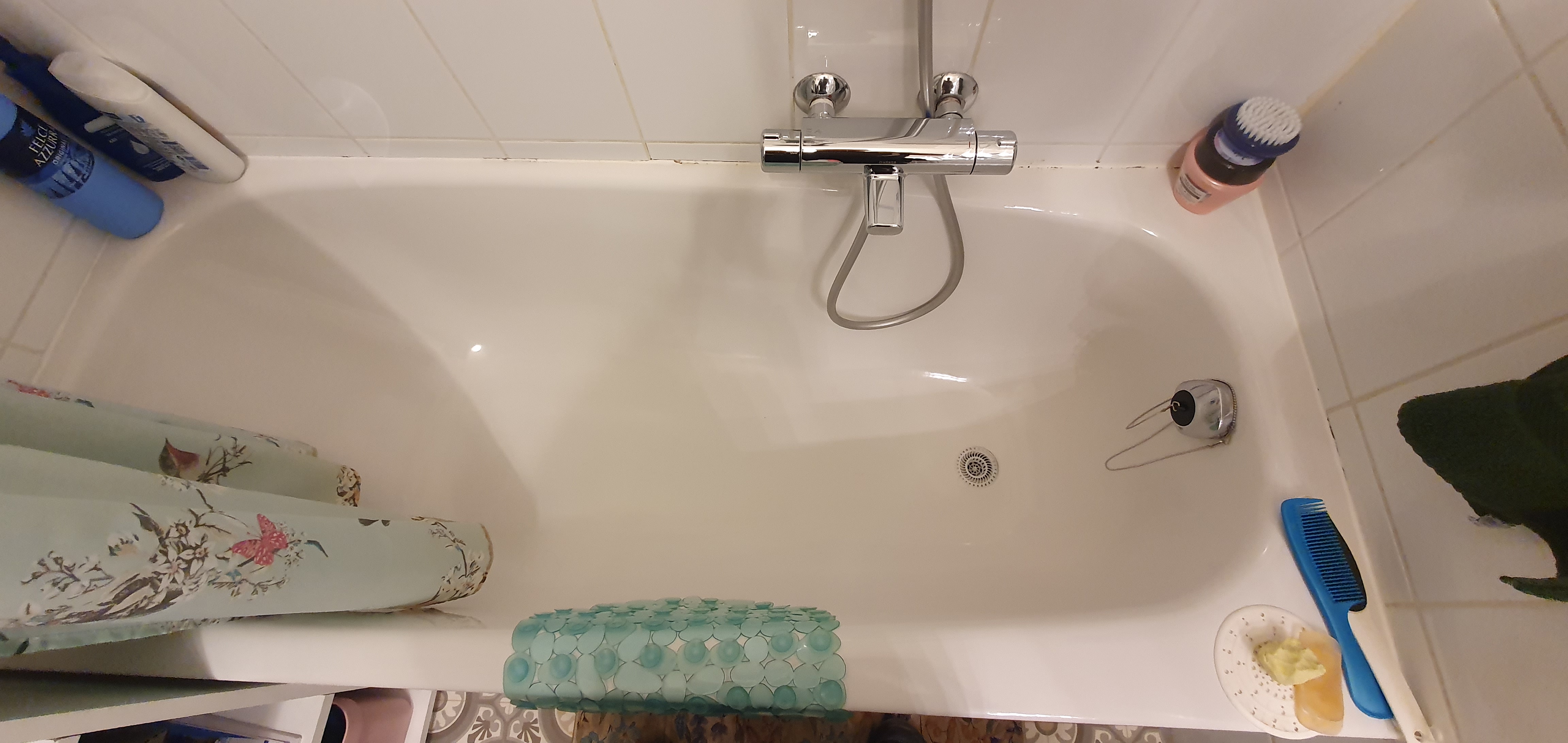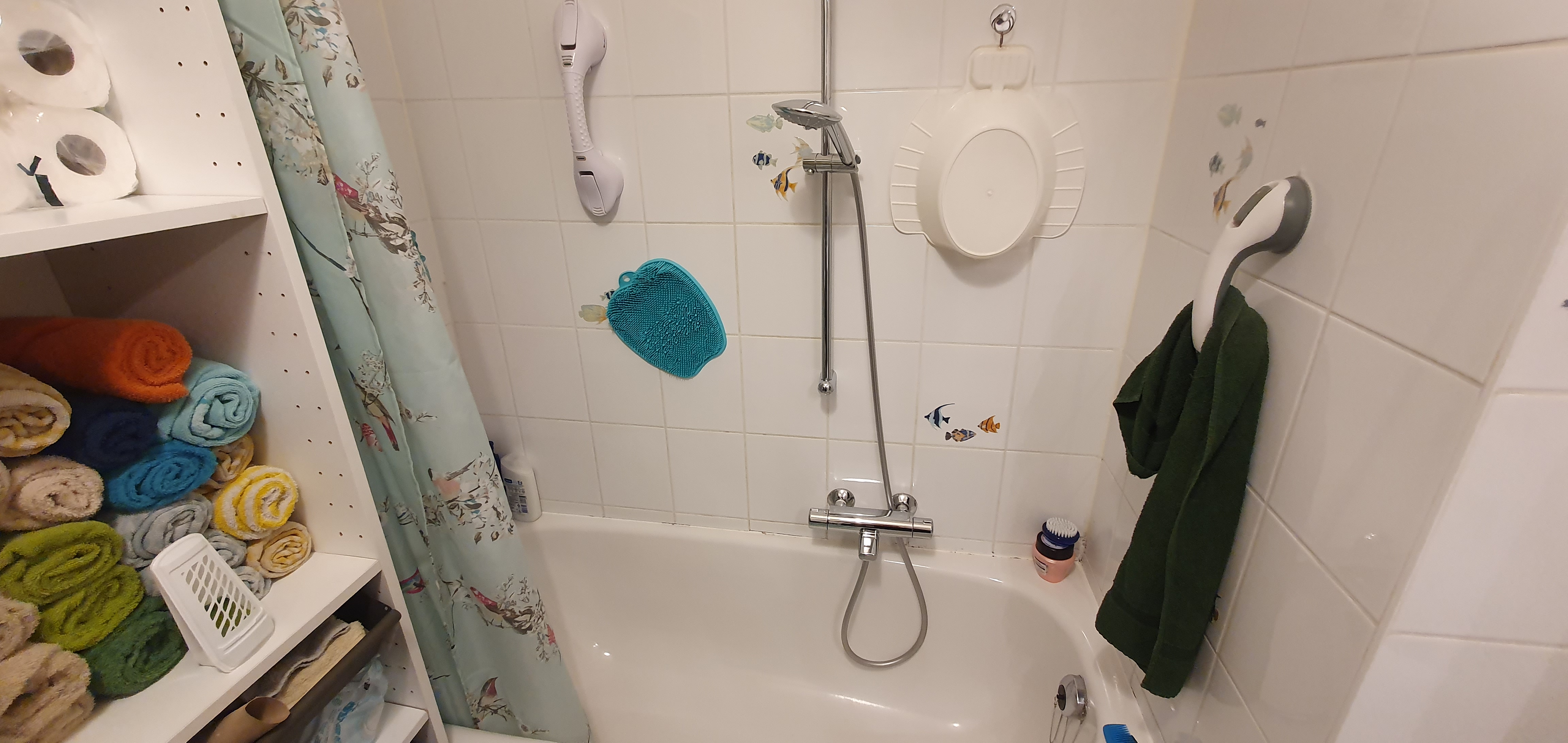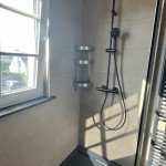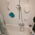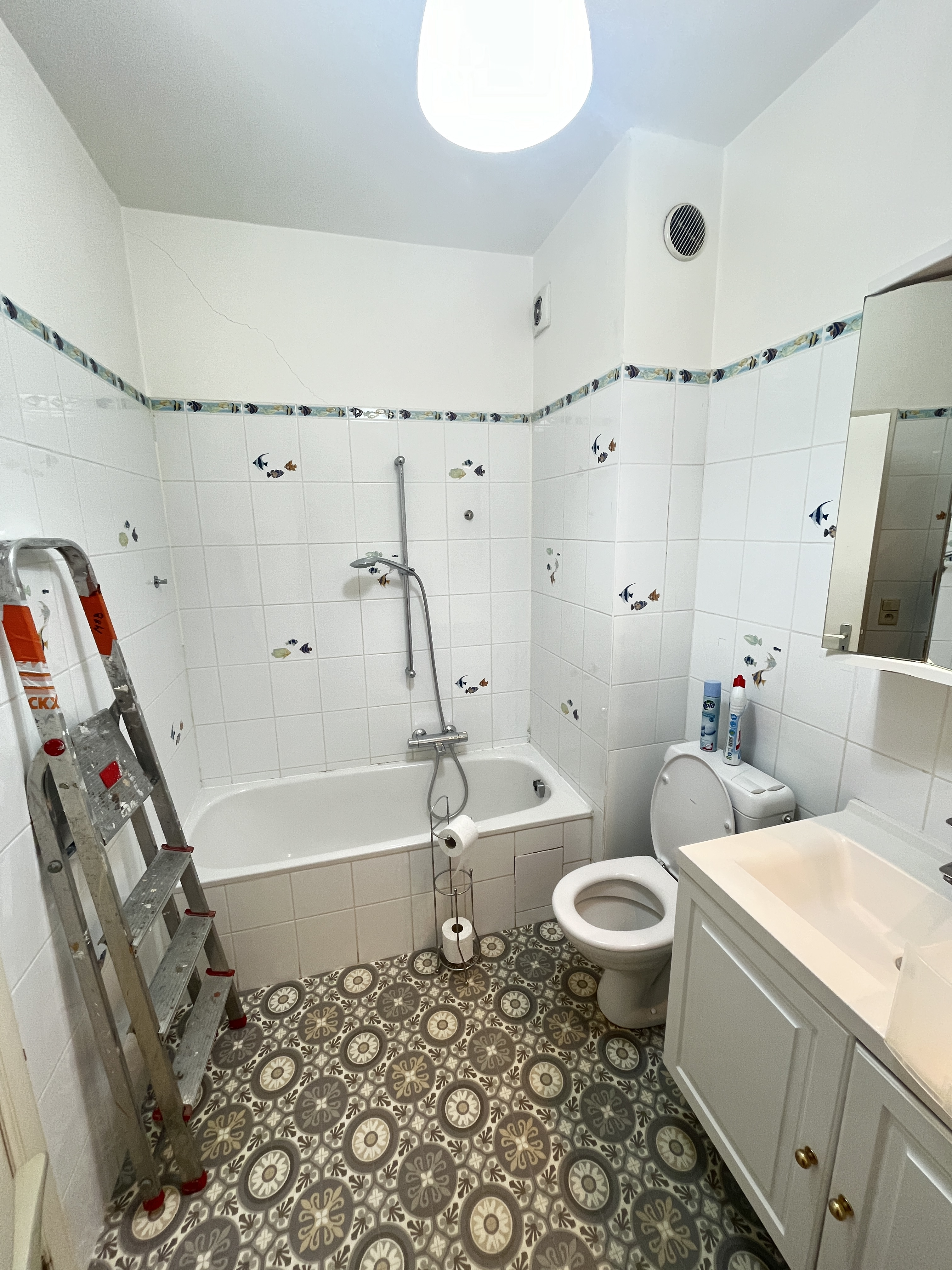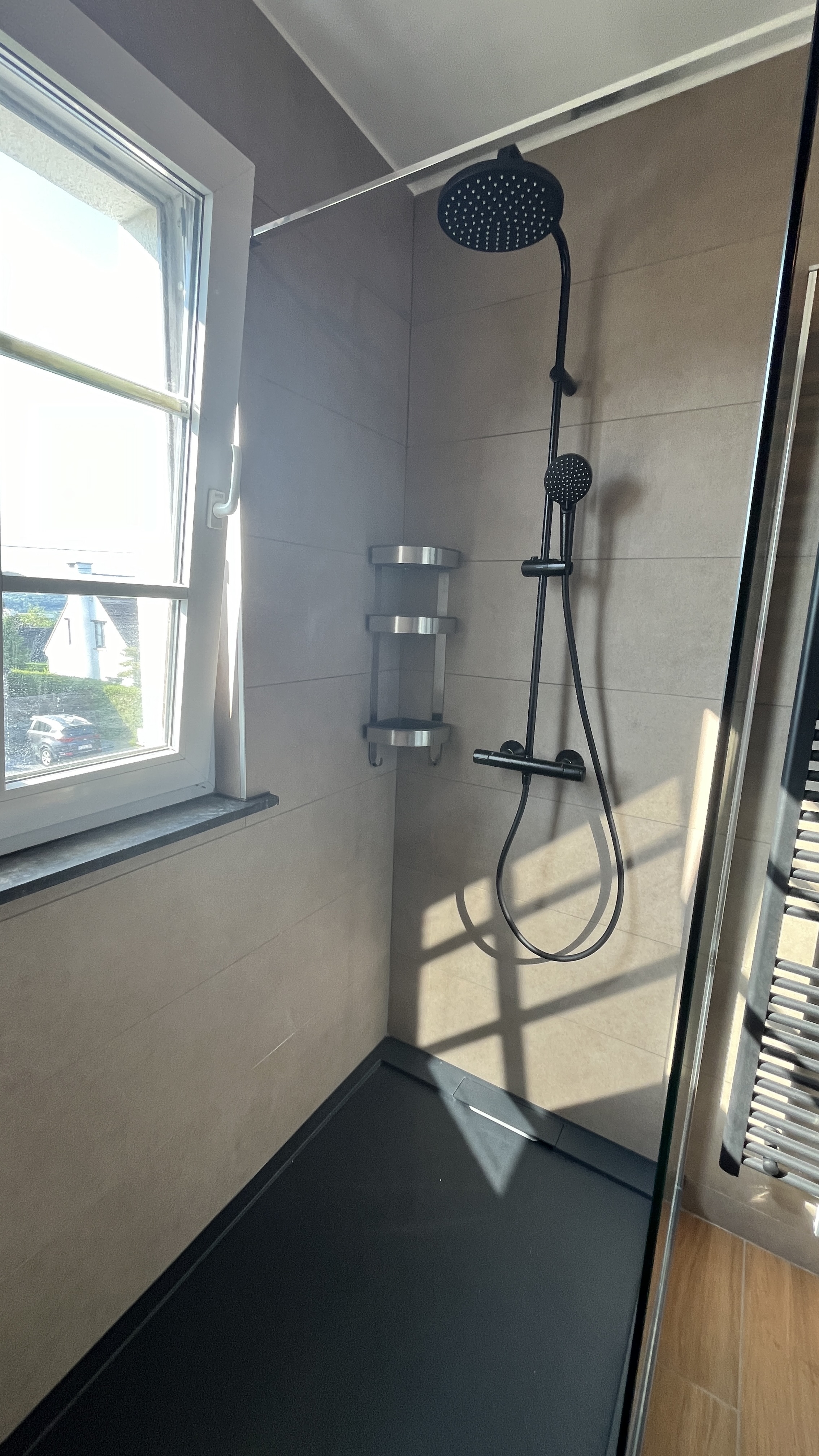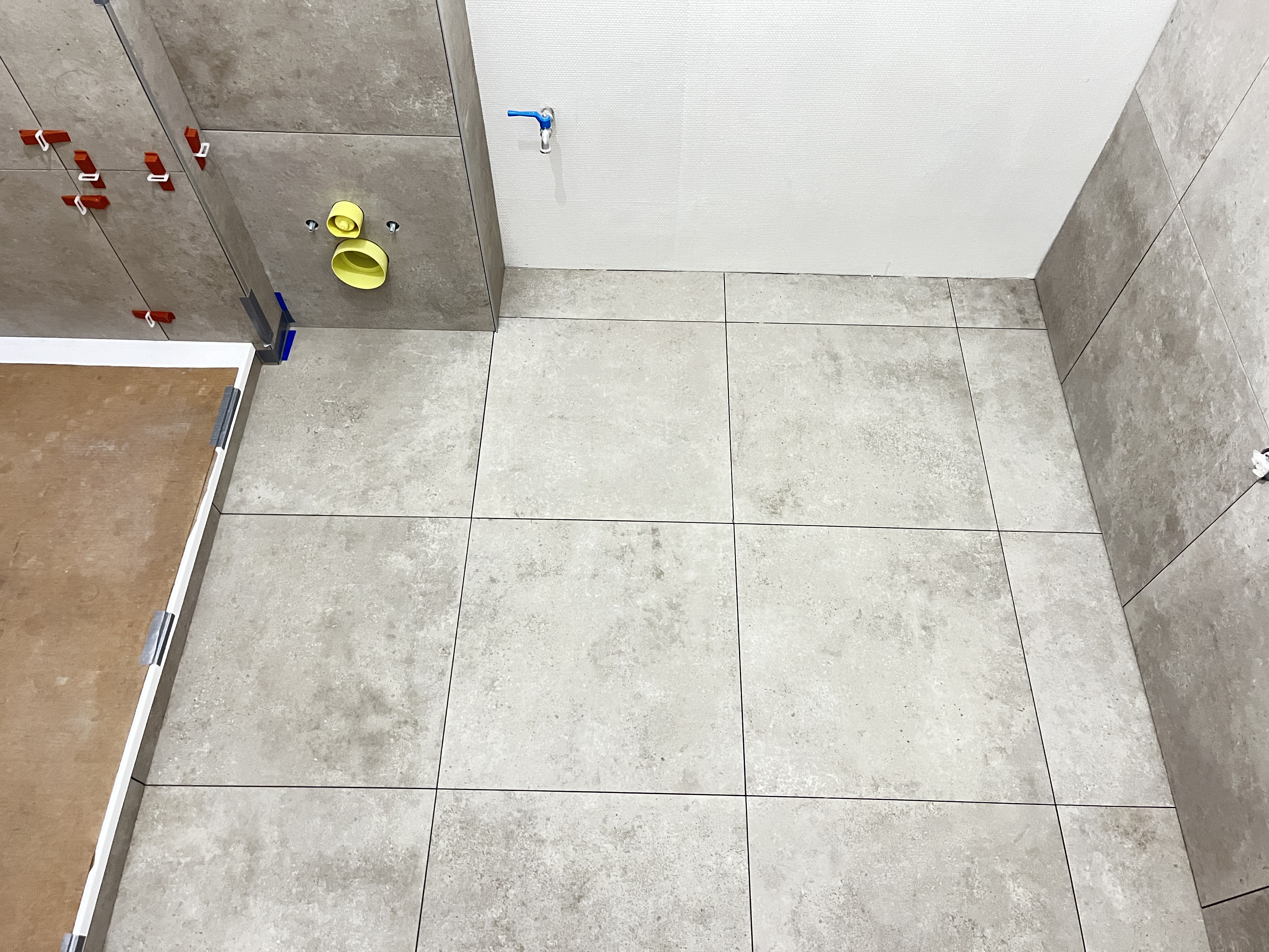 Démontage du bain , modifications des évacuations et alimentations , pose d'un receveur de douche avec paroi vitrée , carrelage imitation bois et béton
