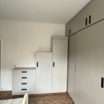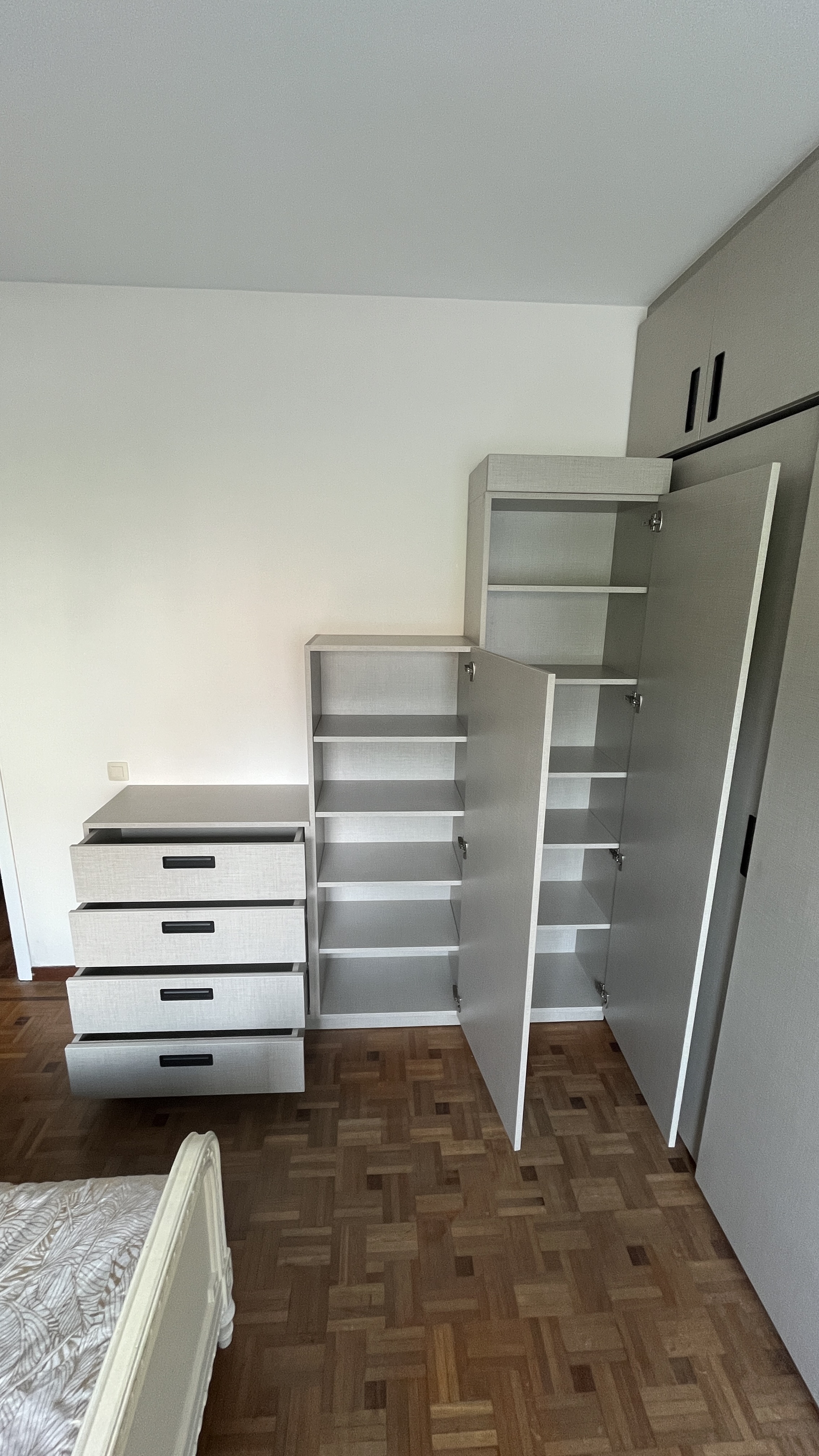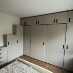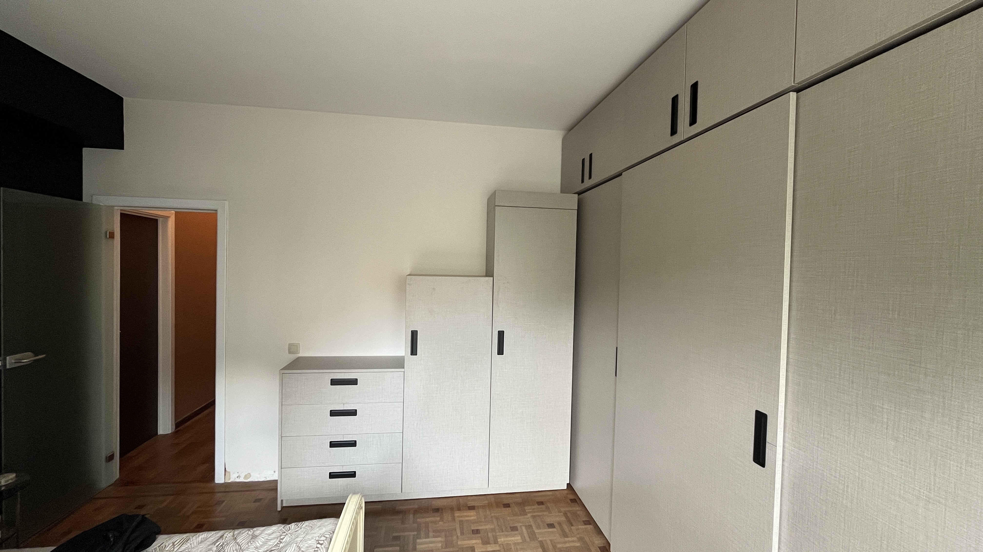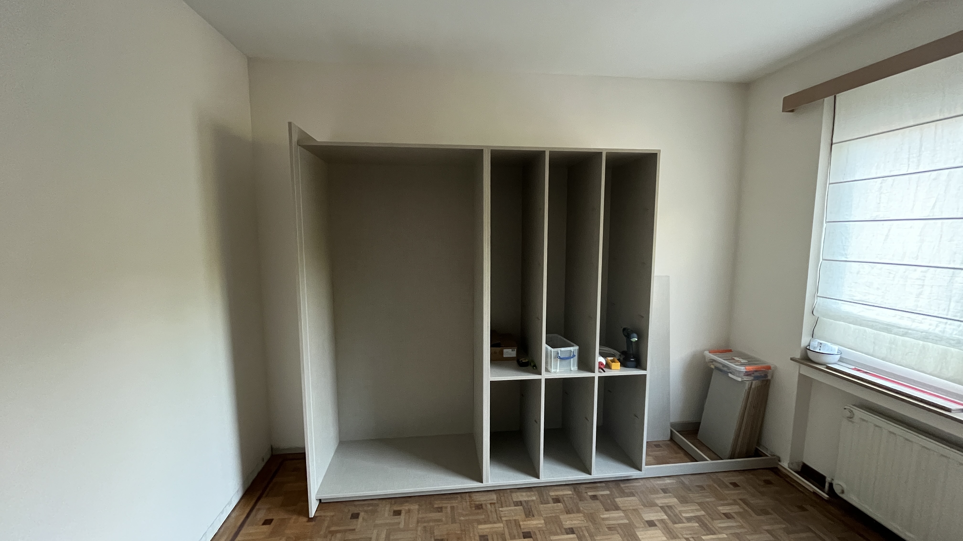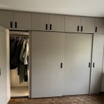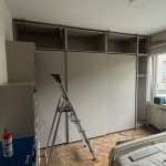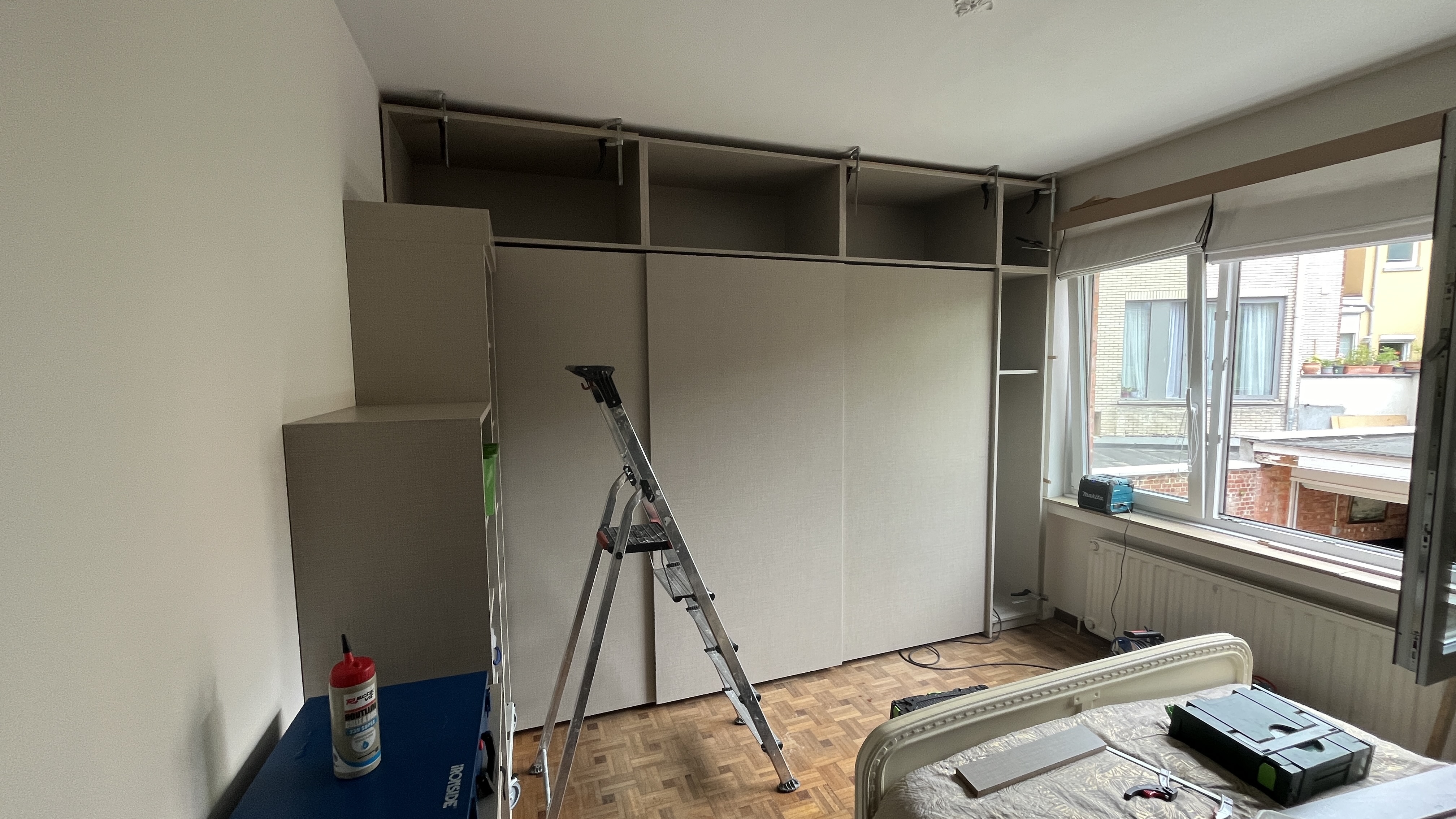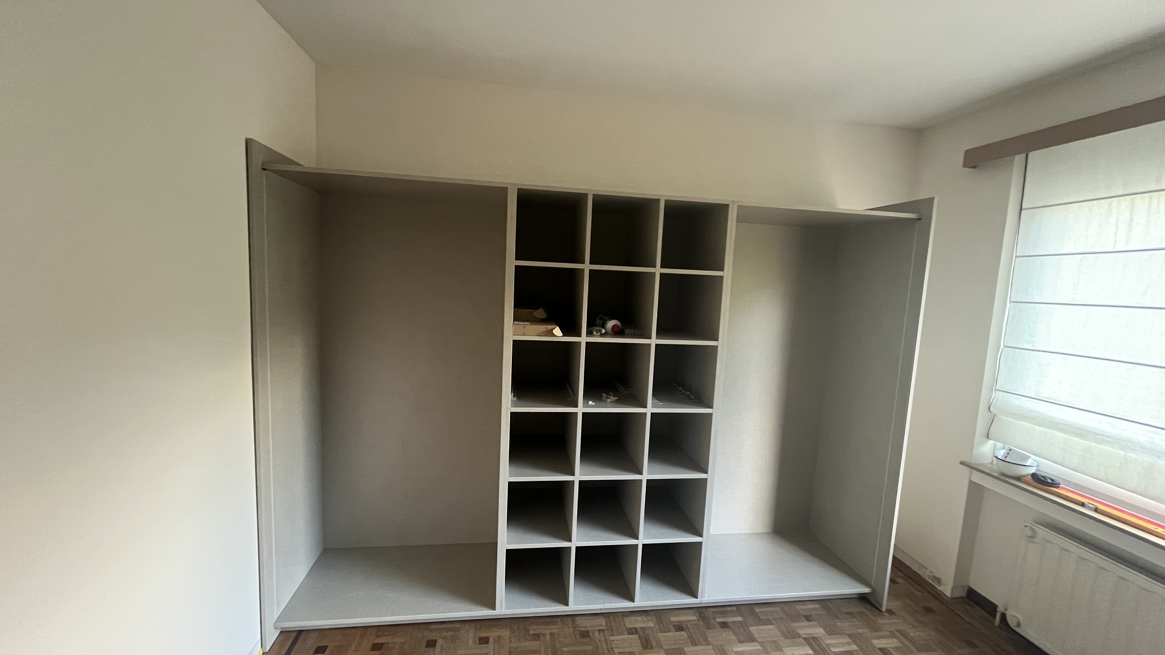 Réalisation de meubles de rangement dans les sous-pentes d'un grenier, portes coulissantes.