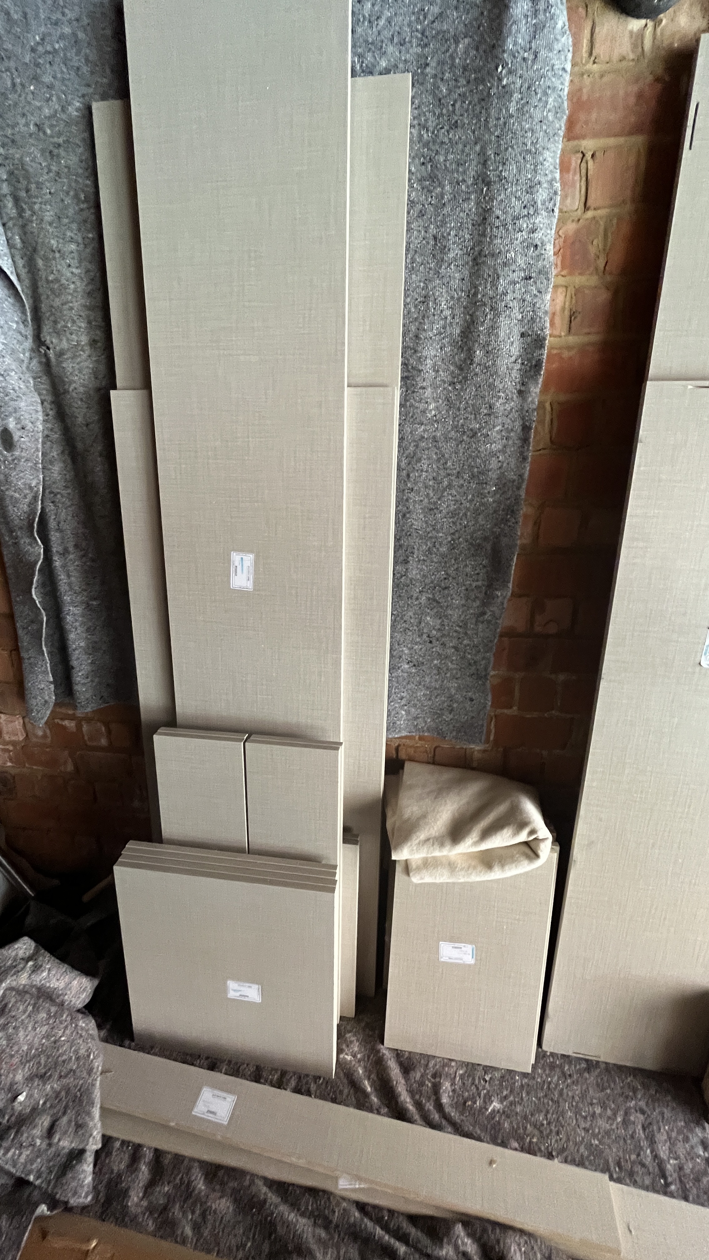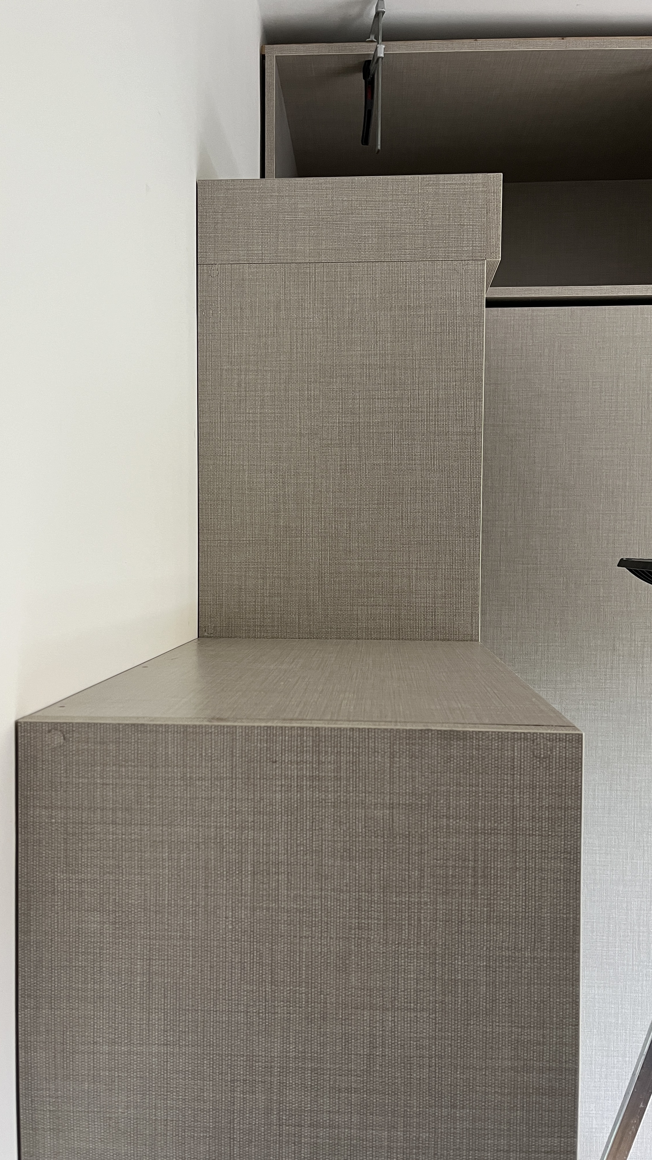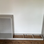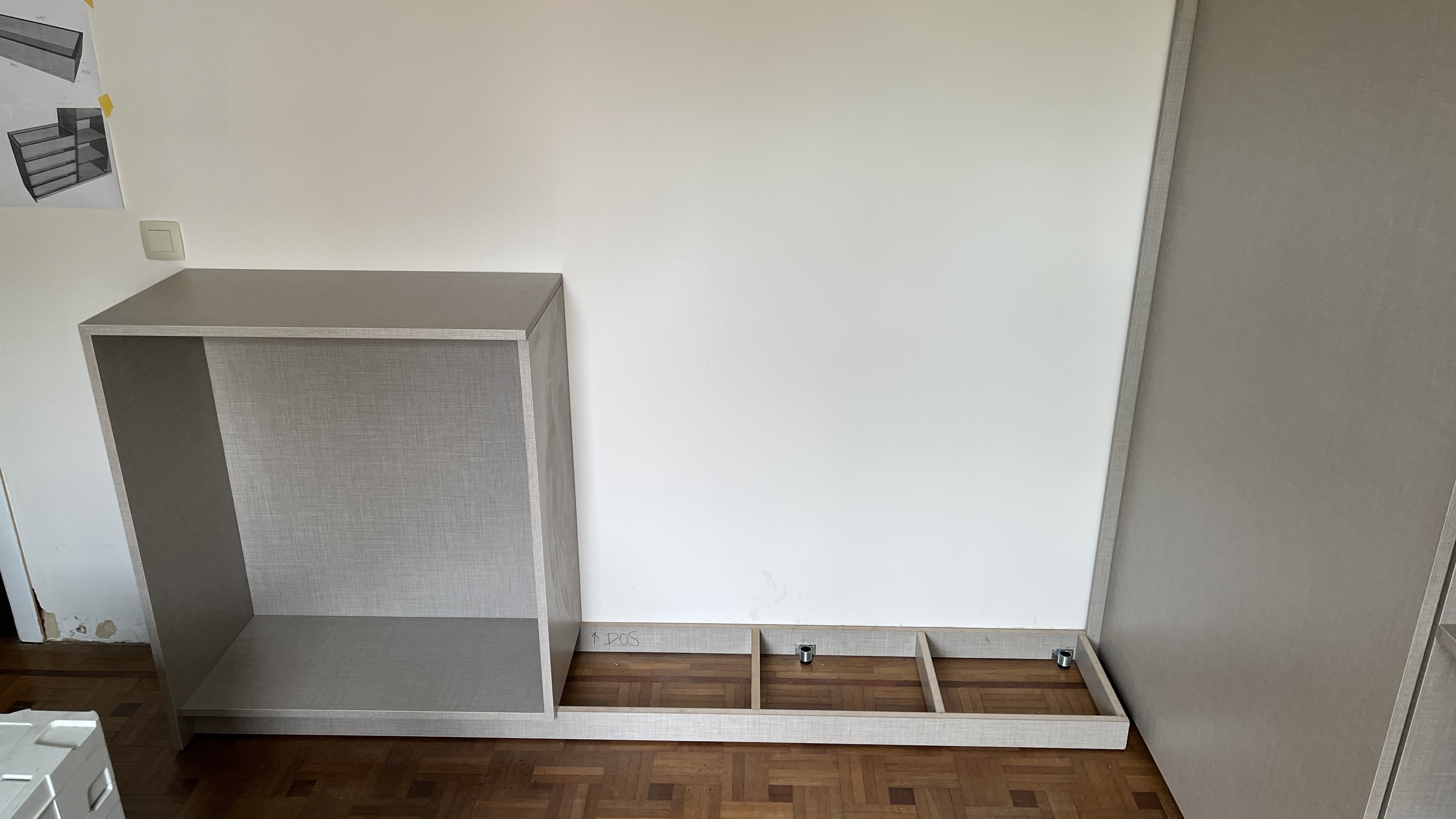 Réalisé en mdf brut, peint sur place, tiroirs Hettich Quadro avec amortisseurs.