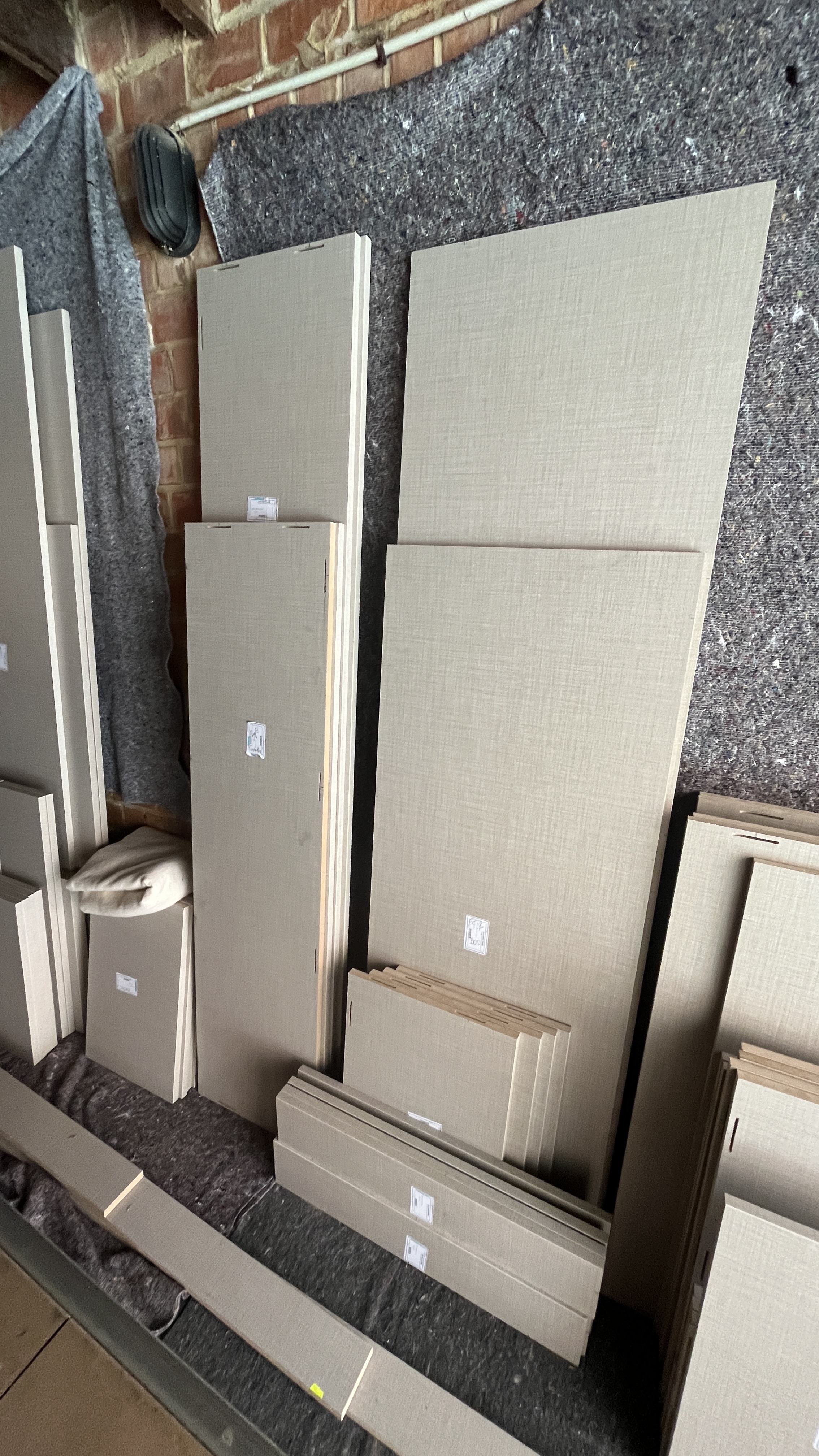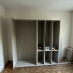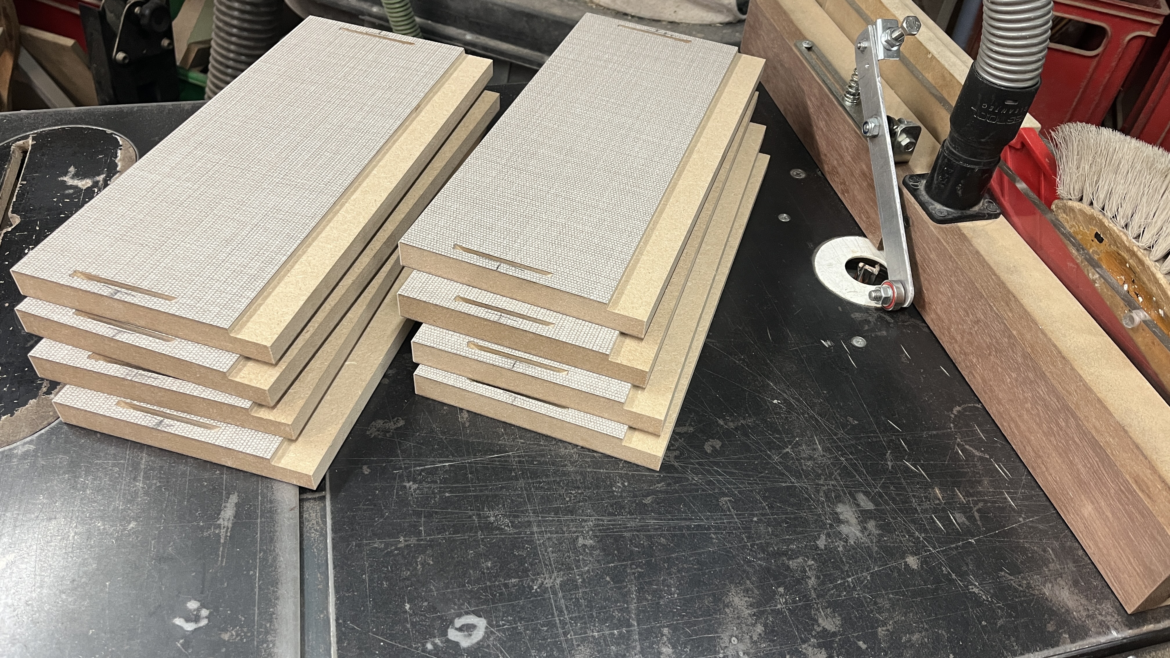 Fabrication d'un meuble en mdf laqué, portes coulissantes, faces de portes rainurées.