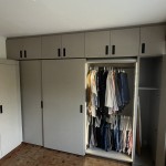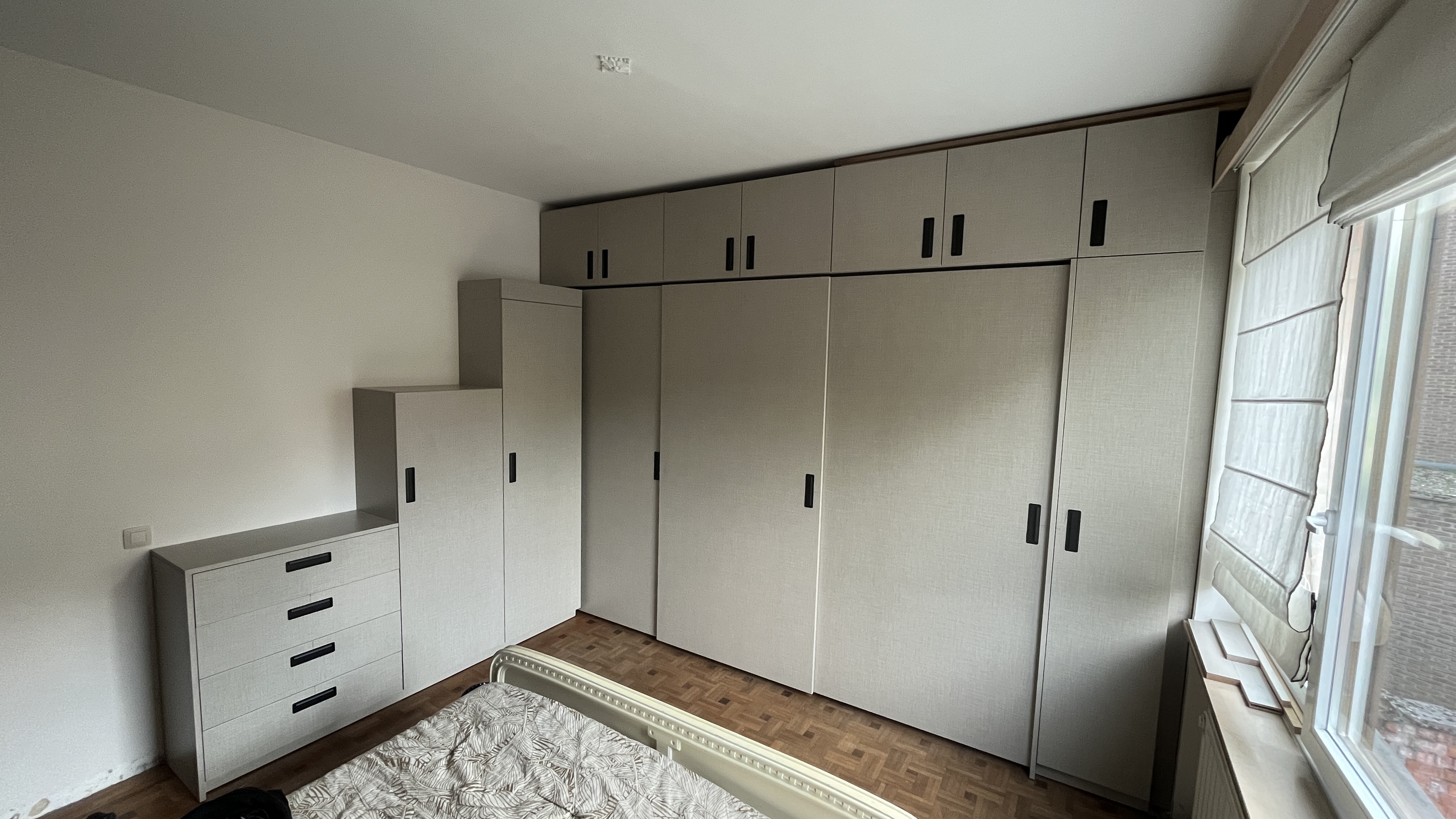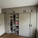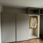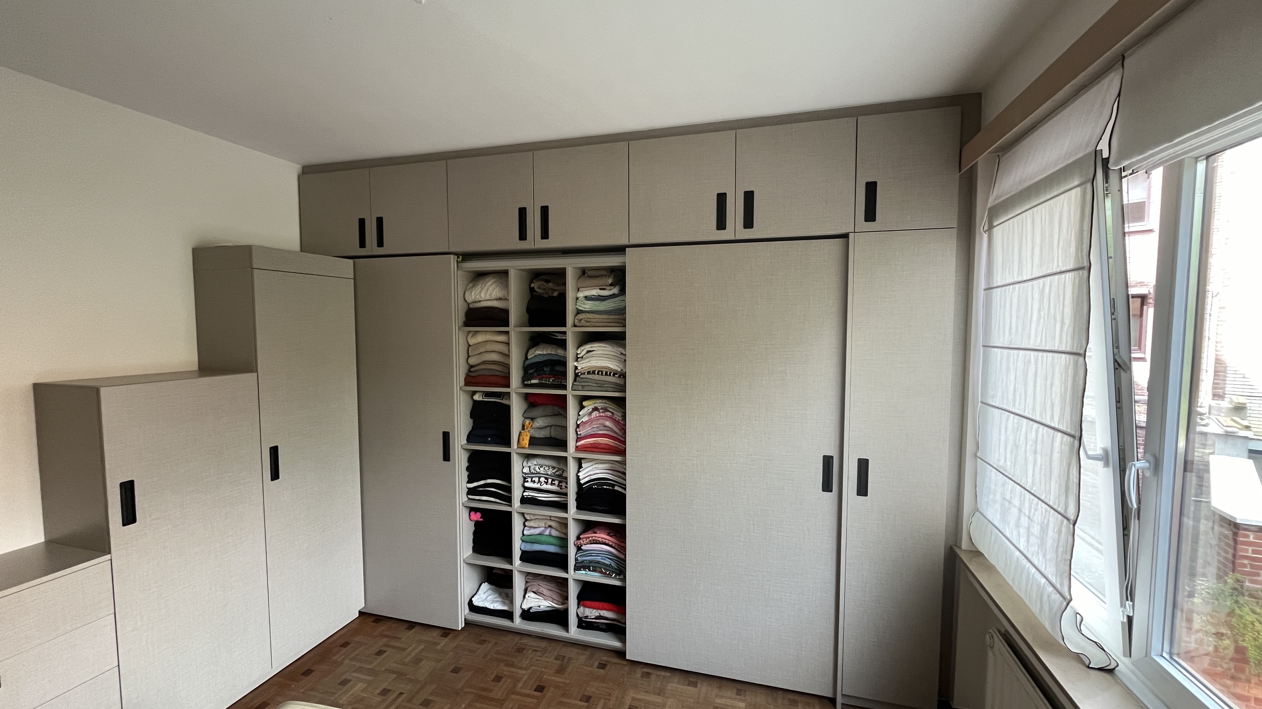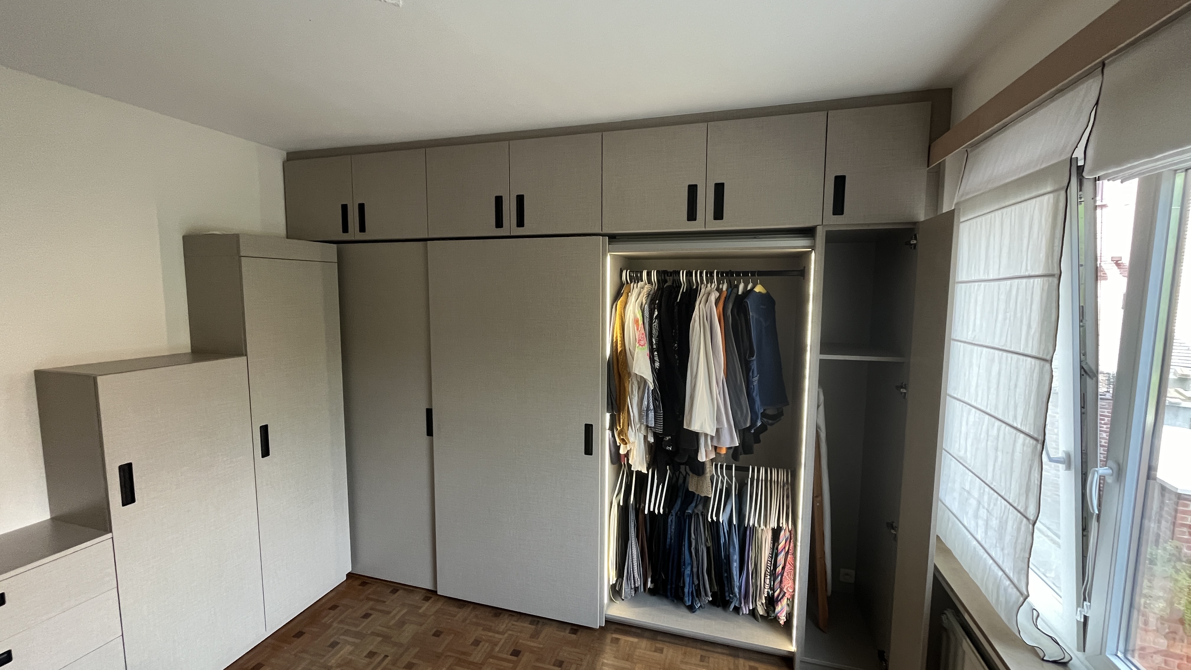Réalisation d'un dressing sur mesure englobant un accumulateur avec meuble d'angle coulissant.